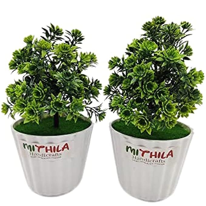 Artificial Plants set of 2 with Pot Bonsai Potted Plastic Faux Green Grass Fake Topiaries Shrubs for Home, Garden and Office Decor