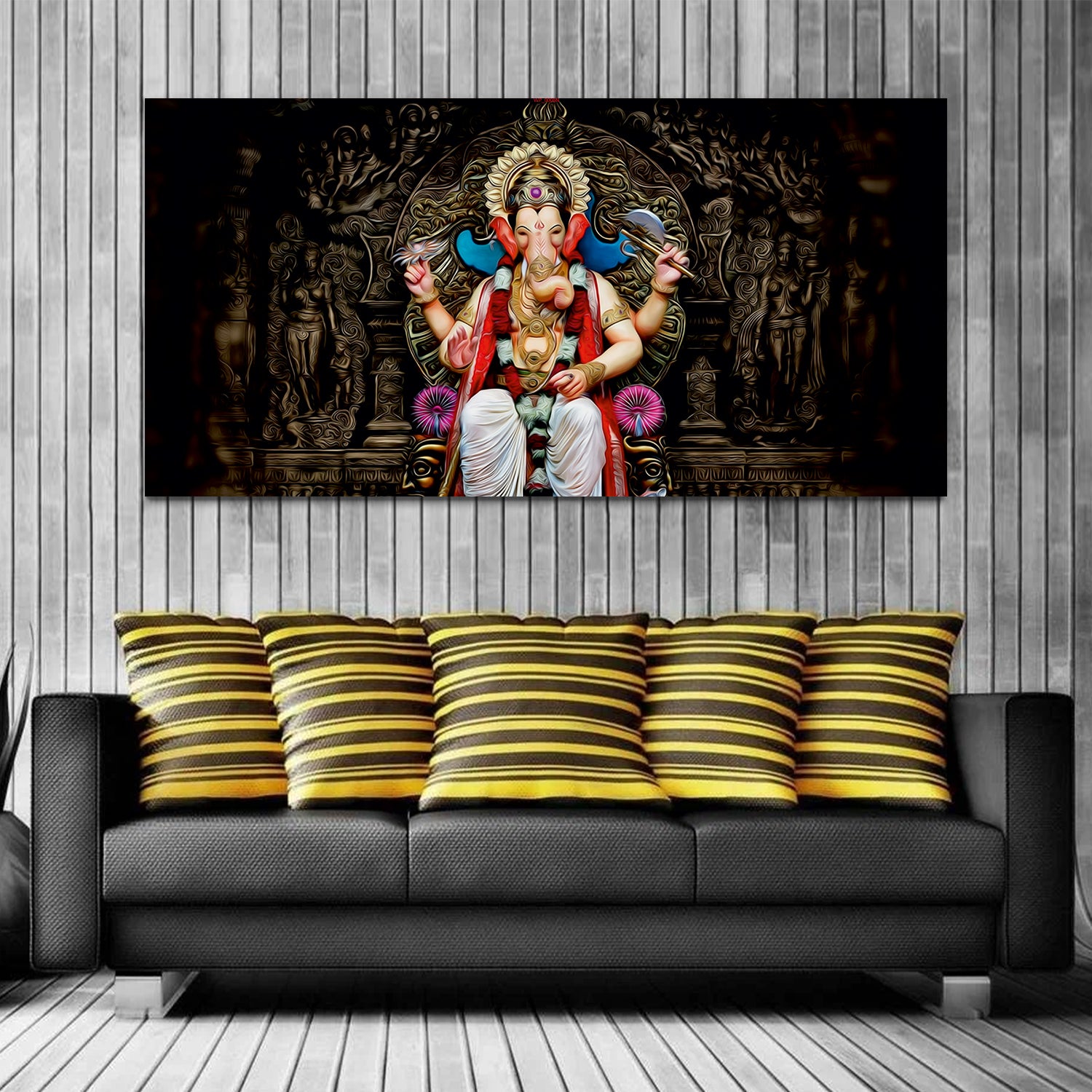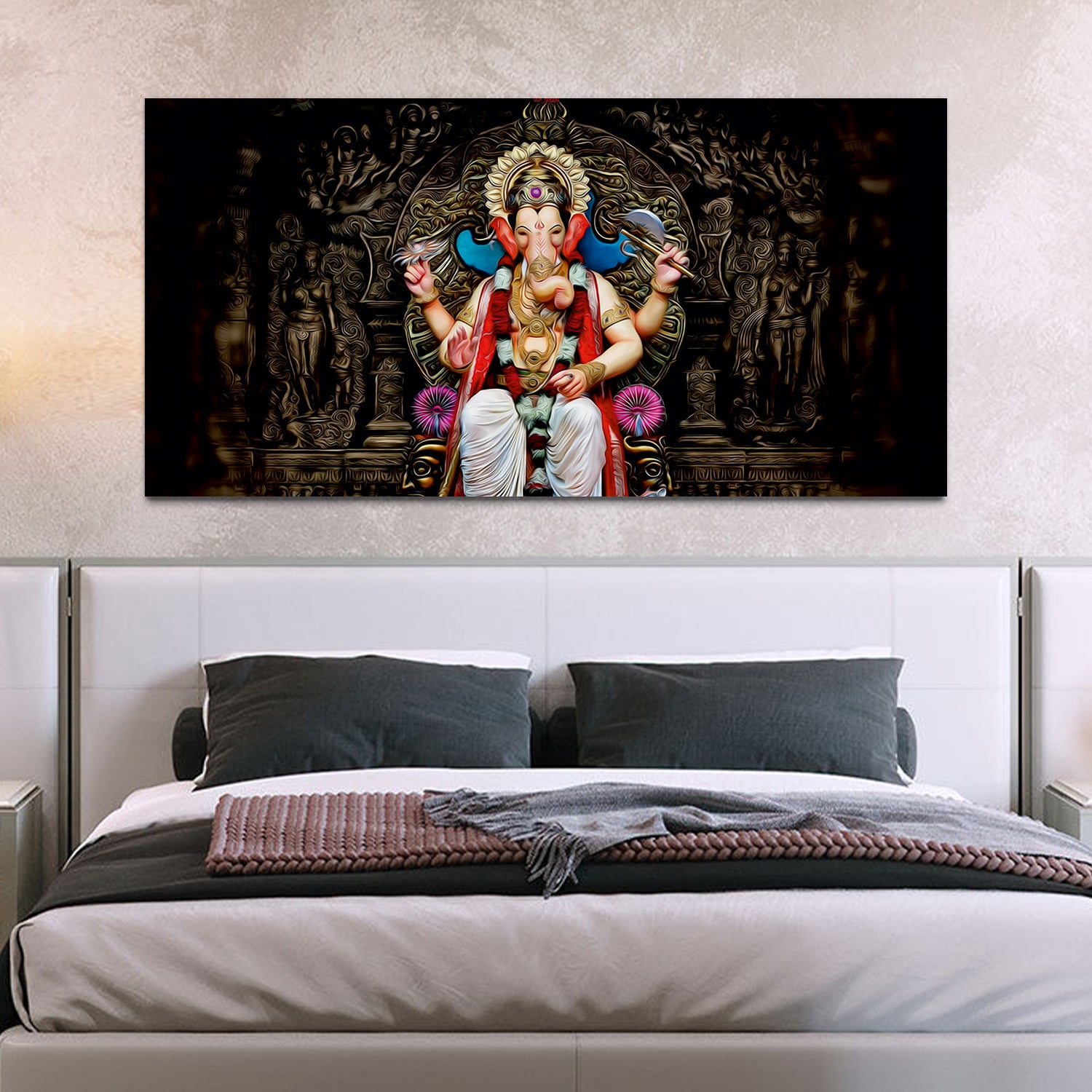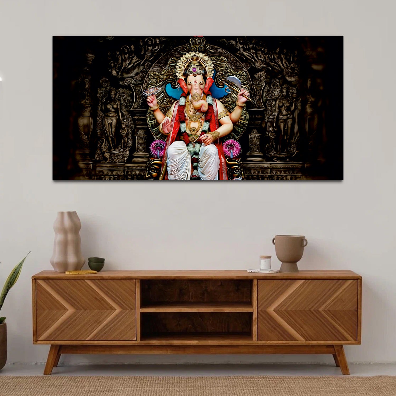 The painting captures the essence of Lord Ganesha's benevolence and grace. Every stroke of the brush conveys a sense of reverence and spirituality, making it a captivating focal point for any room. Experience the divine presence of Lord Ganesha in your home with our captivating Canvas Wall Painting. This exquisite artwork celebrates the revered deity, known as the remover of obstacles and the embodiment of wisdom and prosperity.Adorned with vibrant colors and intricate designs, it serves as a timeless symbol of prosperity, success, and overcoming obstacles.This painting are perfectally used for living room, bedroom, kitchen, office, Hotel, dining room, office.