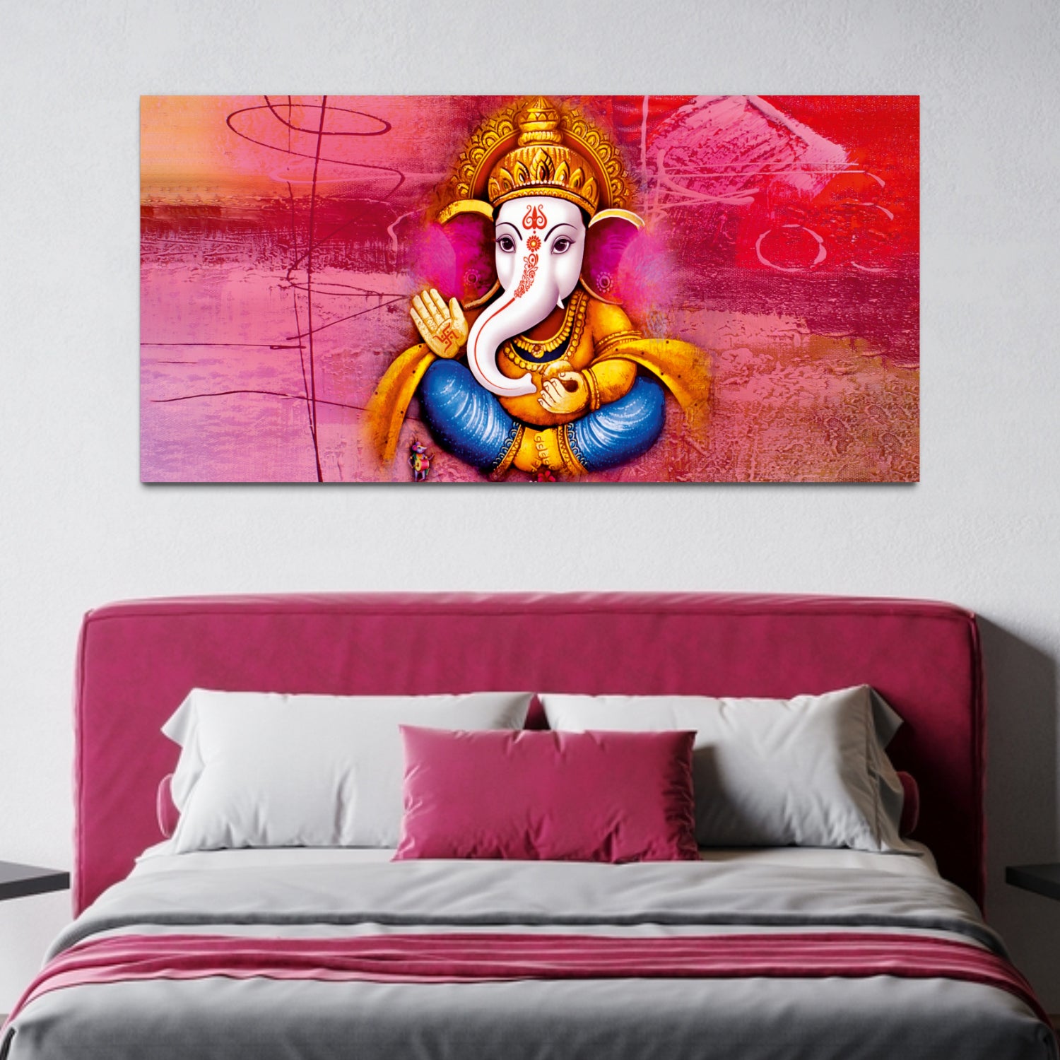 The painting captures the essence of Lord Ganesha's benevolence and grace. Every stroke of the brush conveys a sense of reverence and spirituality, making it a captivating focal point for any room. Experience the divine presence of Lord Ganesha in your home with our captivating Canvas Wall Painting. This exquisite artwork celebrates the revered deity, known as the remover of obstacles and the embodiment of wisdom and prosperity.Adorned with vibrant colors and intricate designs, it serves as a timeless symbol of prosperity, success, and overcoming obstacles.This painting are perfectally used for living room, bedroom, kitchen, office, Hotel, dining room, office.