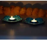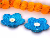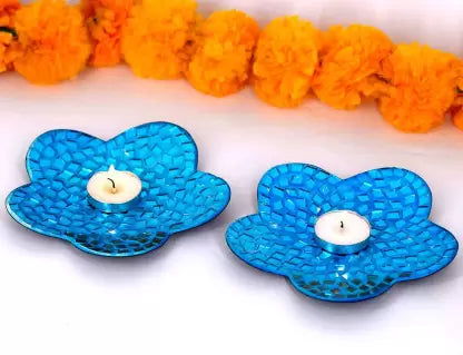 Mithilashri Elegant Tealight Handmade Mirror-Flower Shape Candle Holder -Set of 2 Power Coated Tea Light Holder- Gold/Blue Colour | for Party | Festival | Celebrations | Gift | Lighting-Decoration | with Tea Light |