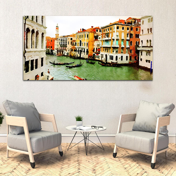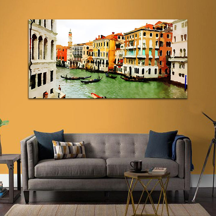 The mural begins with a majestic mountain range that stretches across the entire wall. The mountains are intricately detailed, with rocky surfaces and deep crevices that create a sense of rugged beauty. Shades of cool blues and grays dominate this section, conveying a serene and timeless atmosphere.