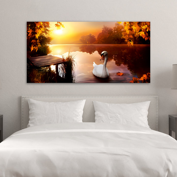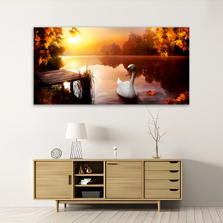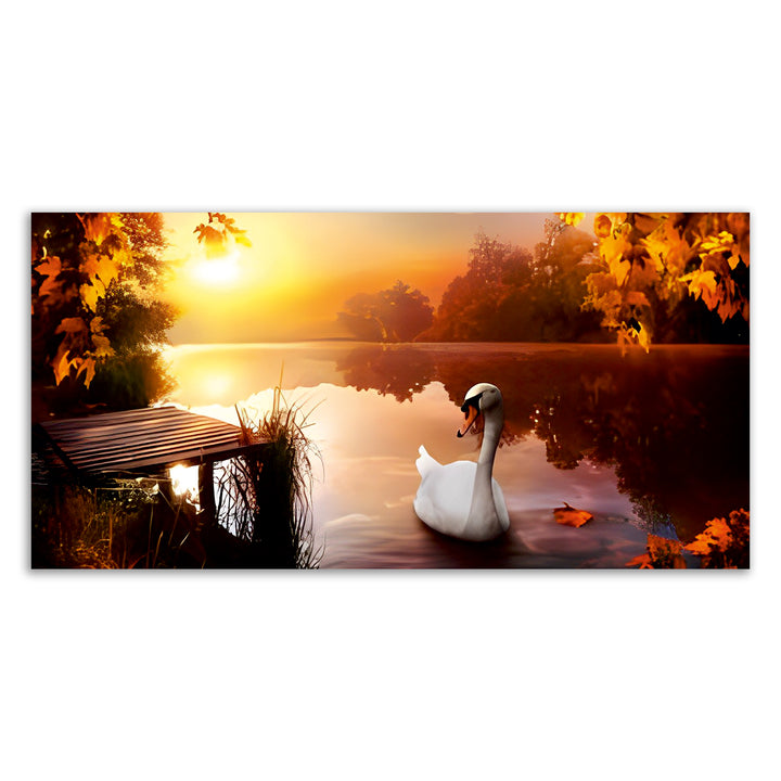 This painting captivating blend of colors, a mesmerizing painting unfolds, capturing the enchanting harmony between a serene sunset and the graceful presence of ducks in flight.The canvas is awash with warm hues of crimson, orange, and gold as the sun gently descends below the horizon, casting its final farewell upon the landscape. The sky is a canvas of swirling clouds, painted in shades of pink and lavender, imbuing the scene with an otherworldly allure.