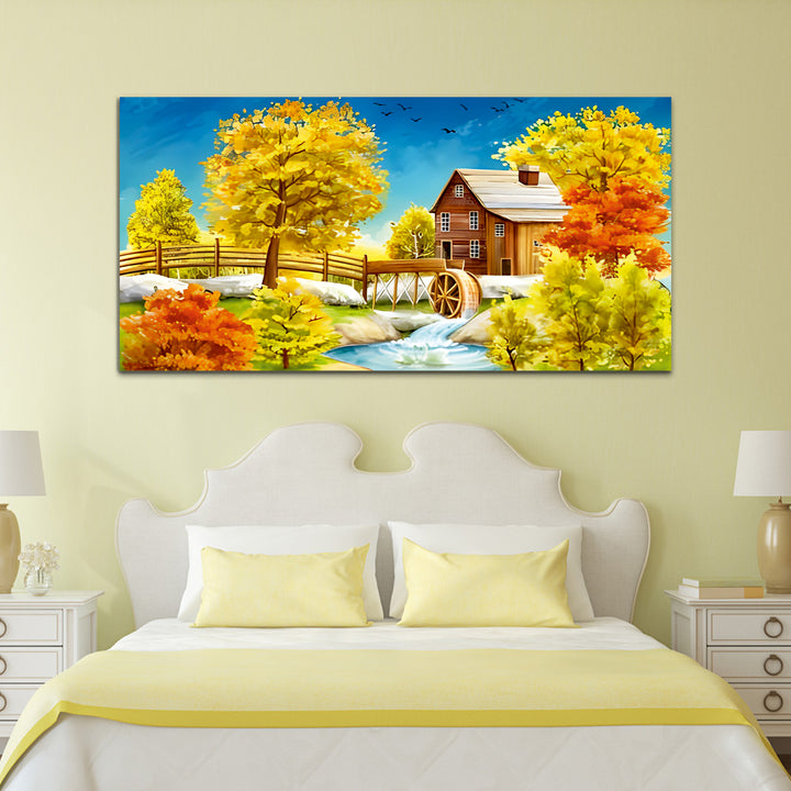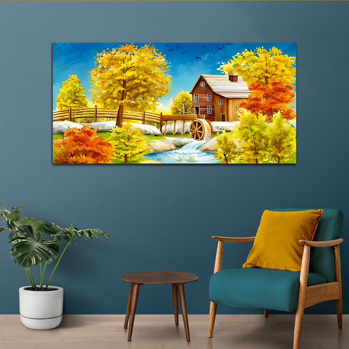 The painting are nature's grandeur, a magnificent forest waterfall takes center stage in a painting that transports the viewer to a realm of pristine beauty and serenity.The canvas bursts forth with lush shades of green, depicting a dense and ancient forest teeming with life. Towering trees stand tall and proud, their verdant foliage creating a canopy that filters the sunlight into dappled patterns of gold and emerald.A perfectlly used for living room, bedroom, kitchen, office, Hotel, dining room, office.
