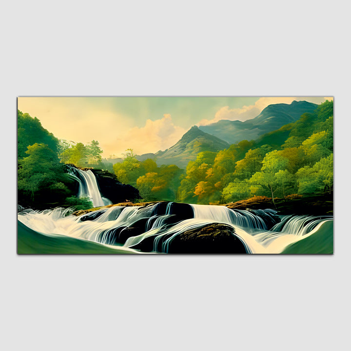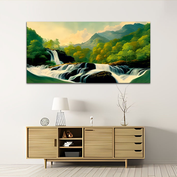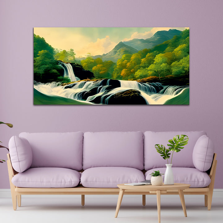 The waterfall painting like a graceful dancer, its crystalline waters tumbling down in a symphony of liquid melodies. Sunlight filters through the dense canopy above, dappling the scene with ethereal light and casting shimmering reflections upon the pool belo. The painting captures the essence of nature's raw beauty with every brushstroke. A waterfall paintings used for living room, bedroom, kitchen, office, Hotel, dining room, office.