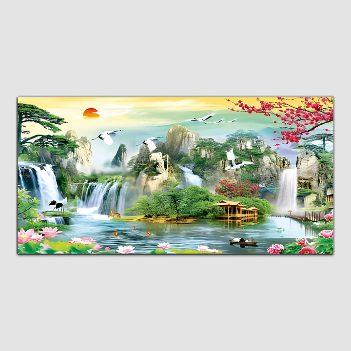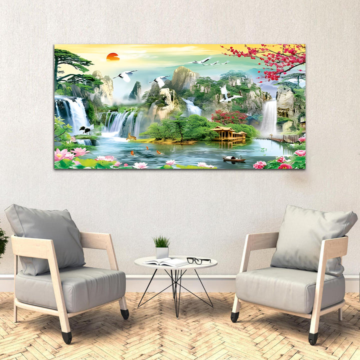 The painting are nature's grandeur, a magnificent forest waterfall takes center stage in a painting that transports the viewer to a realm of pristine beauty and serenity.The canvas bursts forth with lush shades of green, depicting a dense and ancient forest teeming with life. Towering trees stand tall and proud, their verdant foliage creating a canopy that filters the sunlight into dappled patterns of gold and emerald.A perfectlly used for living room, bedroom, kitchen, office, Hotel, dining room, office.