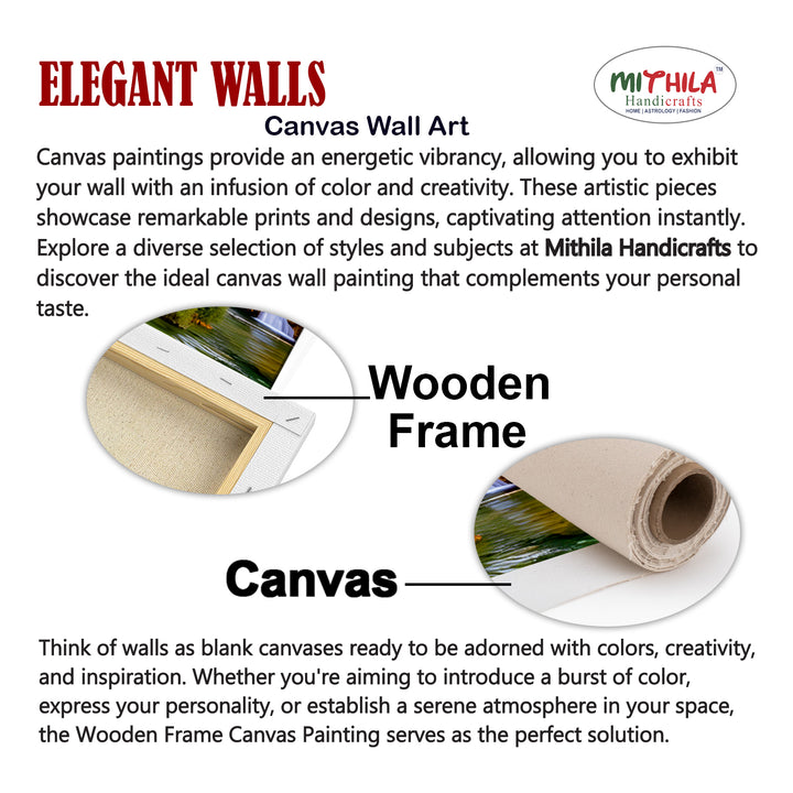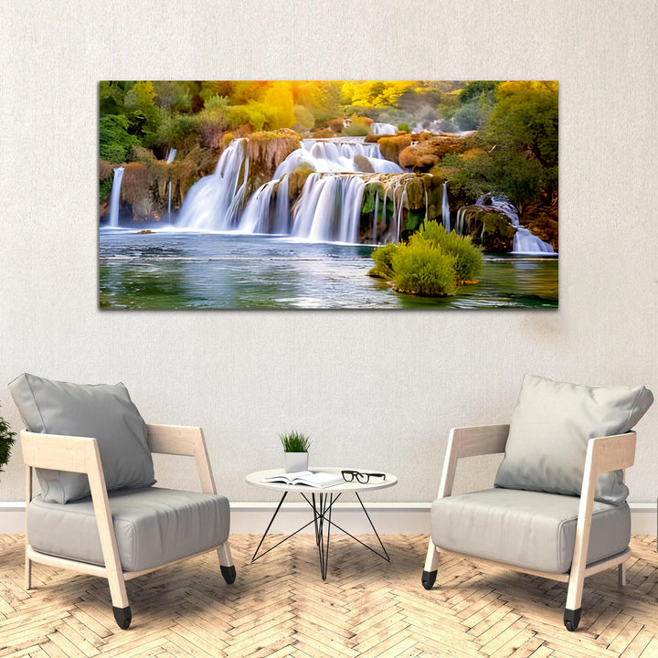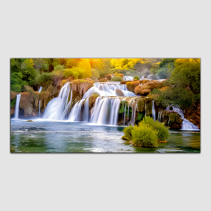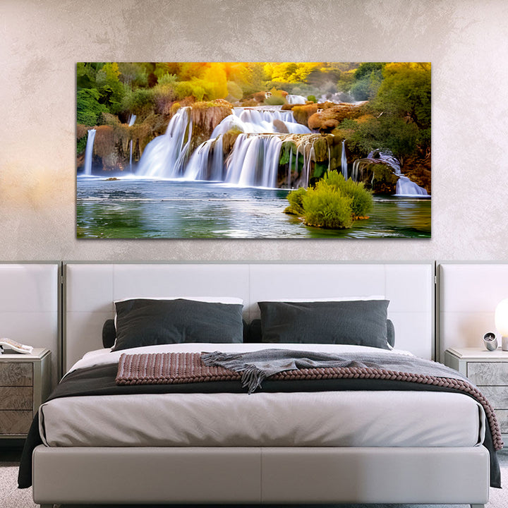 The waterfall painting like a graceful dancer, its crystalline waters tumbling down in a symphony of liquid melodies. Sunlight filters through the dense canopy above, dappling the scene with ethereal light and casting shimmering reflections upon the pool belo. The painting captures the essence of nature's raw beauty with every brushstroke. A waterfall paintings used for living room, bedroom, kitchen, office, Hotel, dining room, office.