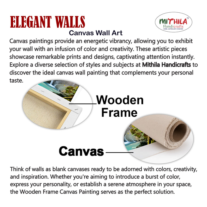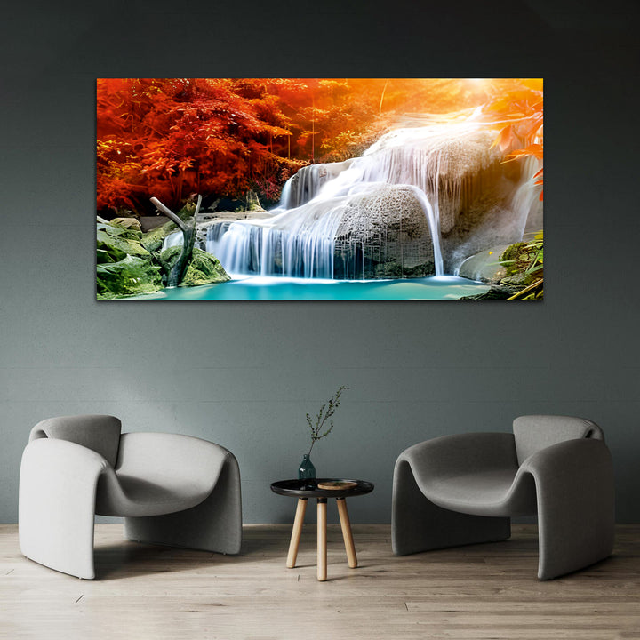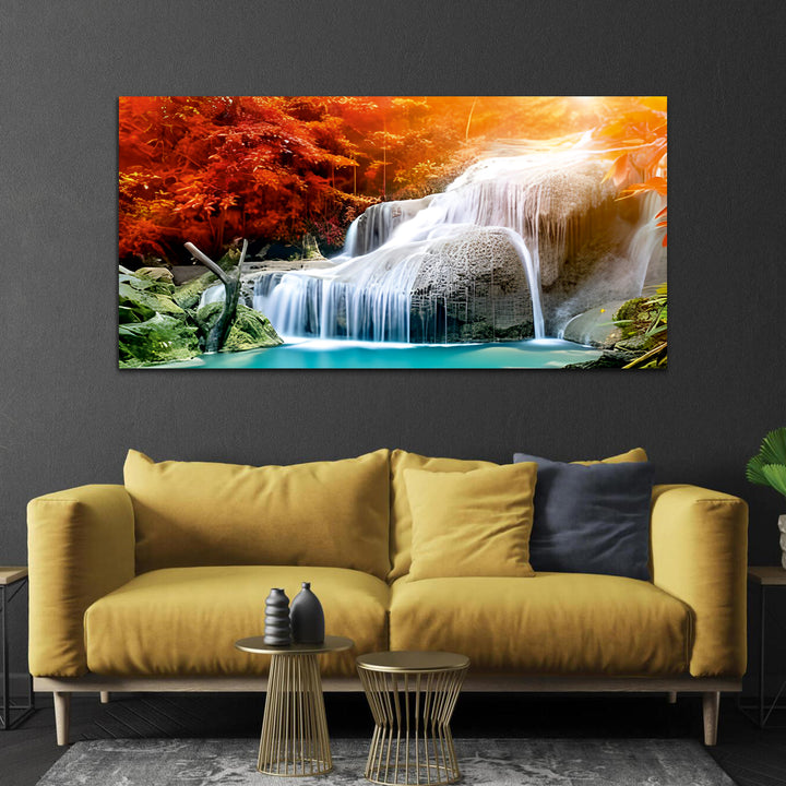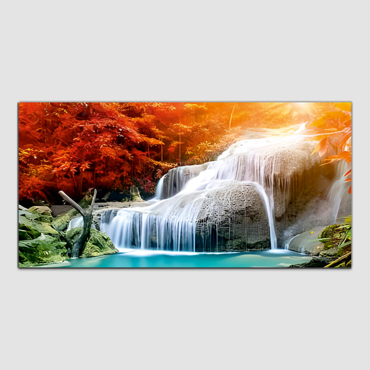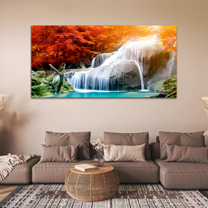 The waterfall painting like a graceful dancer, its crystalline waters tumbling down in a symphony of liquid melodies. Sunlight filters through the dense canopy above, dappling the scene with ethereal light and casting shimmering reflections upon the pool belo. The painting captures the essence of nature's raw beauty with every brushstroke. A waterfall paintings used for living room, bedroom, kitchen, office, Hotel, dining room, office.