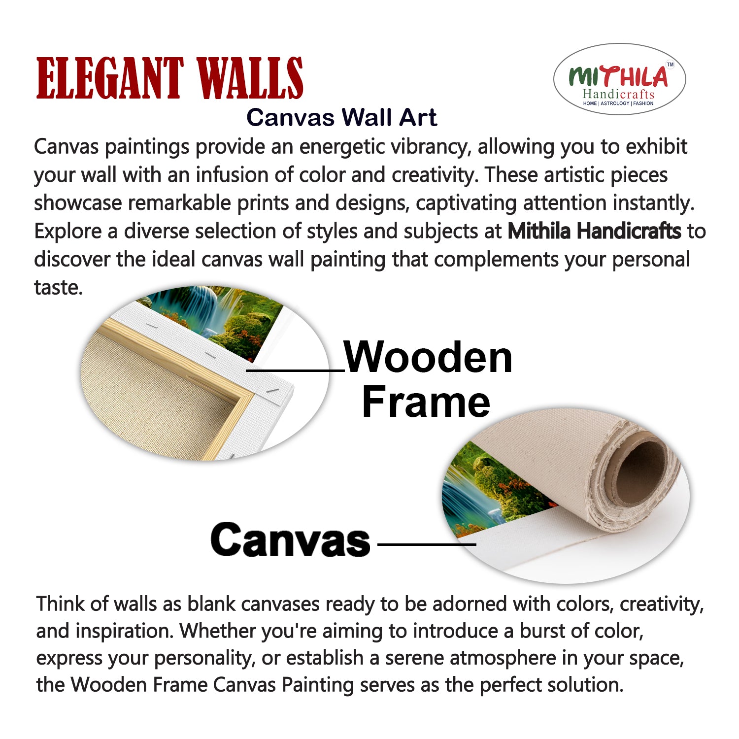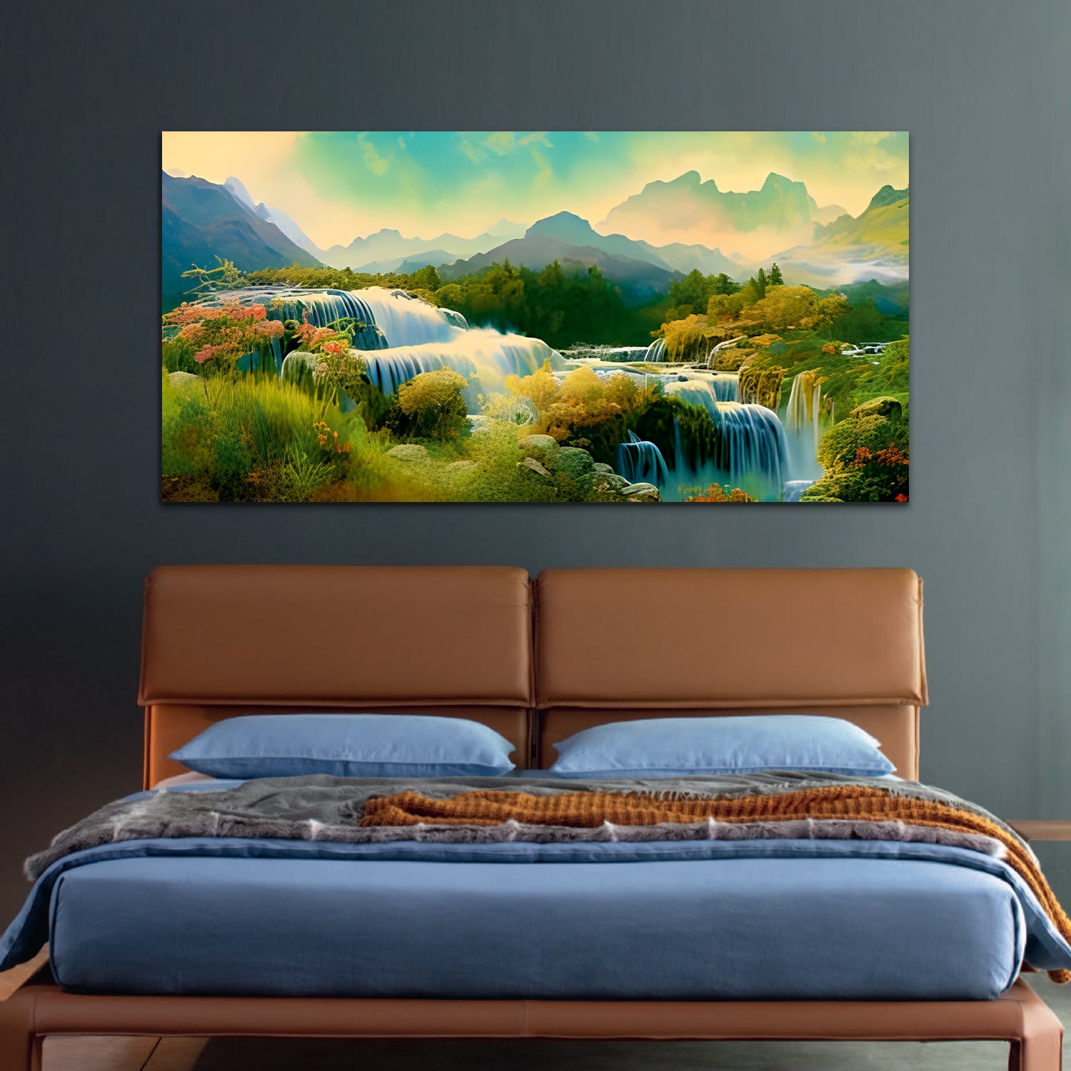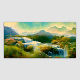 The waterfall painting like a graceful dancer, its crystalline waters tumbling down in a symphony of liquid melodies. Sunlight filters through the dense canopy above, dappling the scene with ethereal light and casting shimmering reflections upon the pool belo. The painting captures the essence of nature's raw beauty with every brushstroke. A waterfall paintings used for living room, bedroom, kitchen, office, Hotel, dining room, office.