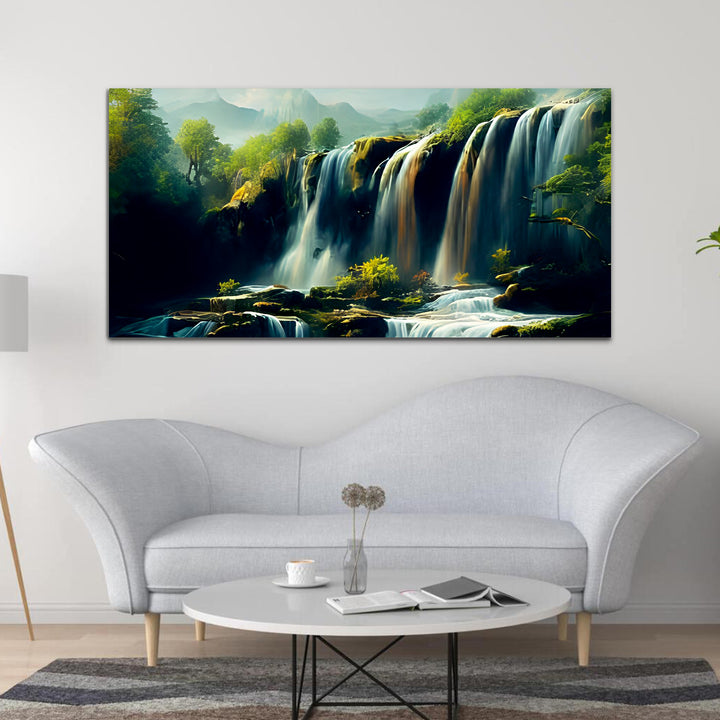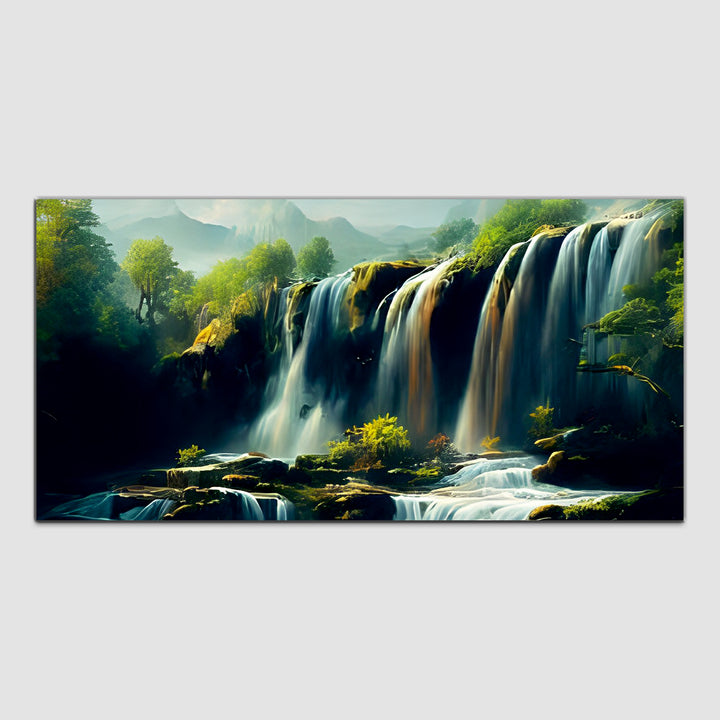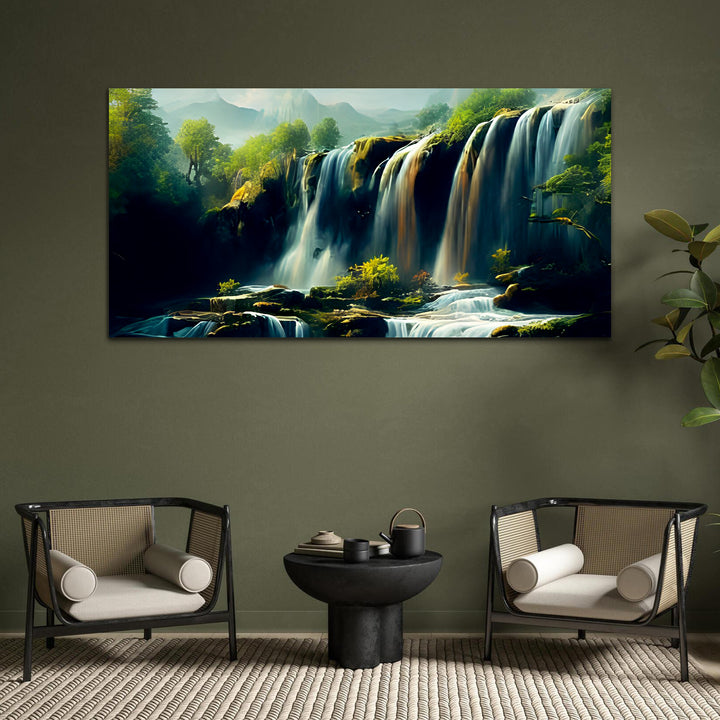 The waterfall painting like a graceful dancer, its crystalline waters tumbling down in a symphony of liquid melodies. Sunlight filters through the dense canopy above, dappling the scene with ethereal light and casting shimmering reflections upon the pool belo. The painting captures the essence of nature's raw beauty with every brushstroke. A waterfall paintings used for living room, bedroom, kitchen, office, Hotel, dining room, office.