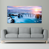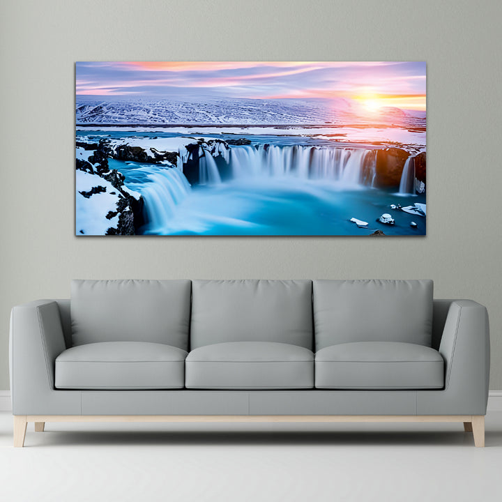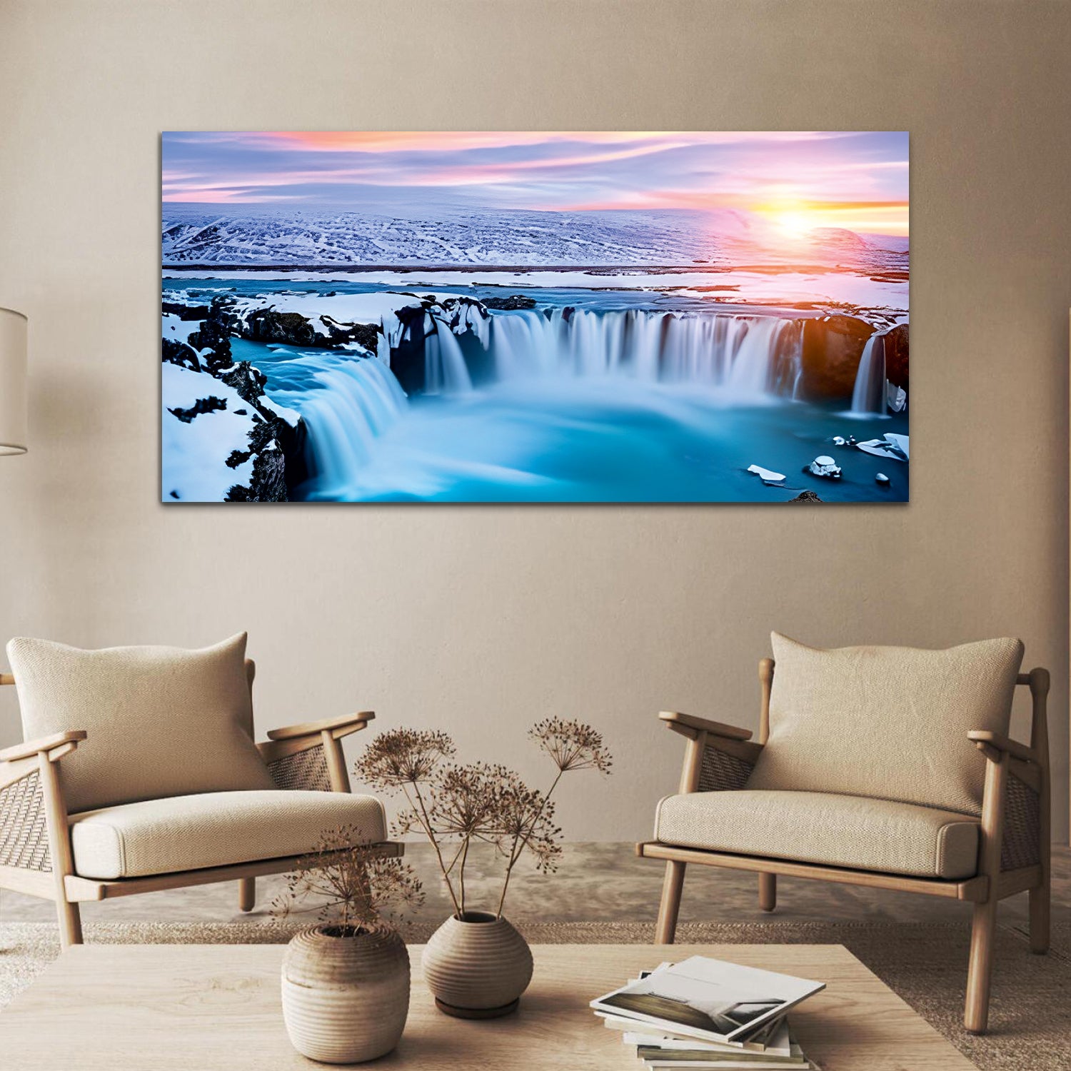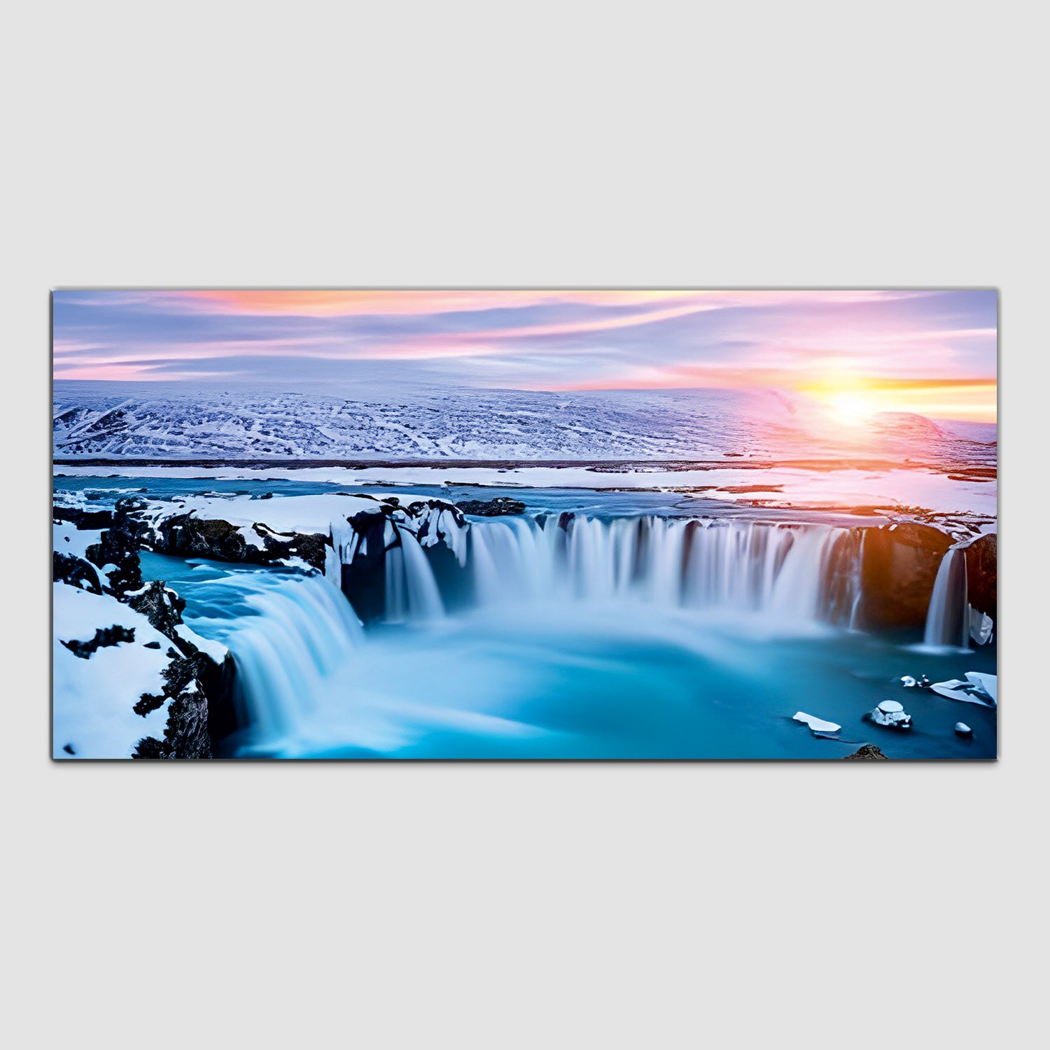 The waterfall painting like a graceful dancer, its crystalline waters tumbling down in a symphony of liquid melodies. Sunlight filters through the dense canopy above, dappling the scene with ethereal light and casting shimmering reflections upon the pool belo. The painting captures the essence of nature's raw beauty with every brushstroke. A waterfall paintings used for living room, bedroom, kitchen, office, Hotel, dining room, office.