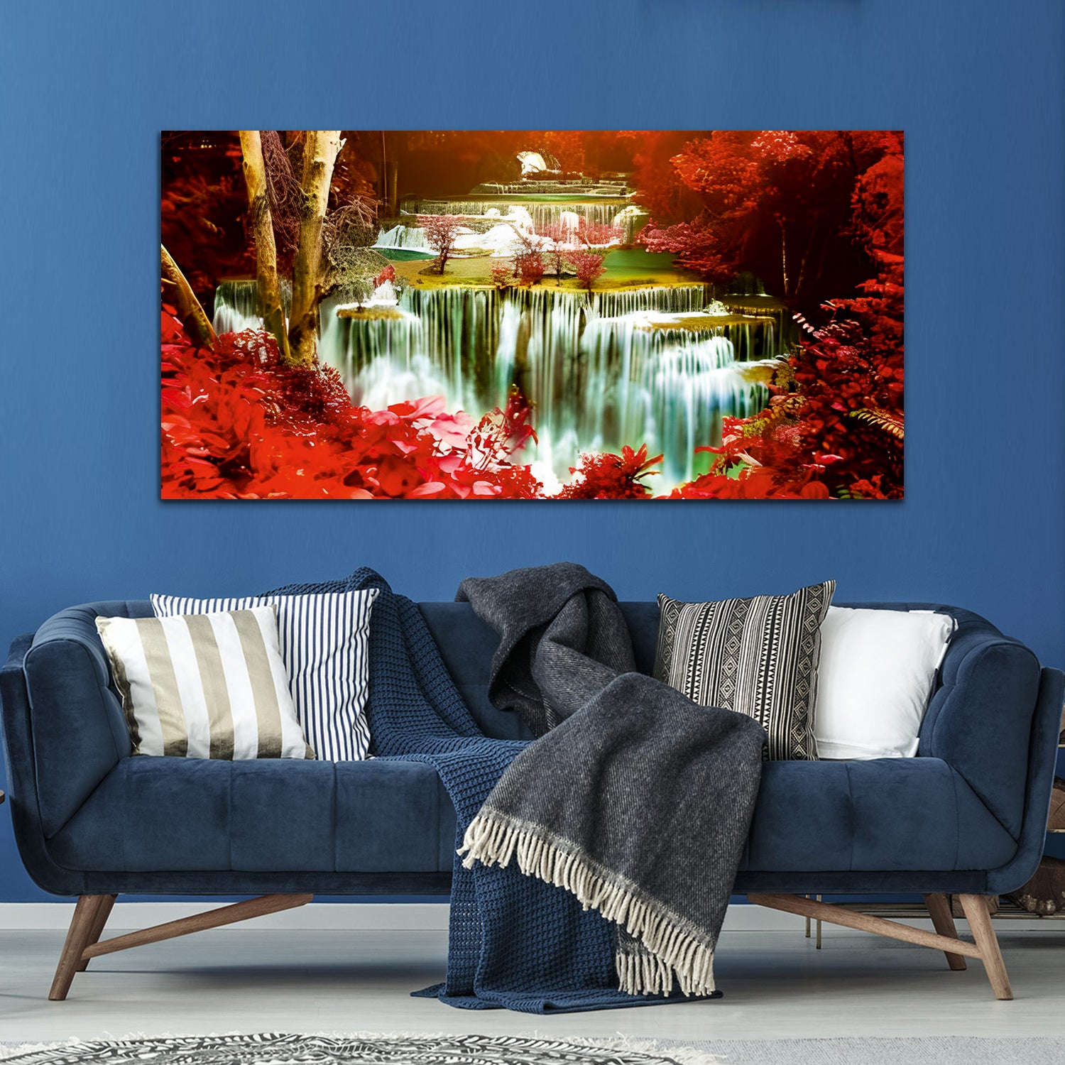 The waterfall painting like a graceful dancer, its crystalline waters tumbling down in a symphony of liquid melodies. Sunlight filters through the dense canopy above, dappling the scene with ethereal light and casting shimmering reflections upon the pool belo. The painting captures the essence of nature's raw beauty with every brushstroke. A waterfall paintings used for living room, bedroom, kitchen, office, Hotel, dining room, office.