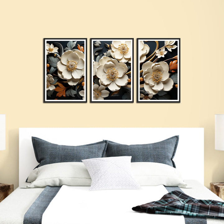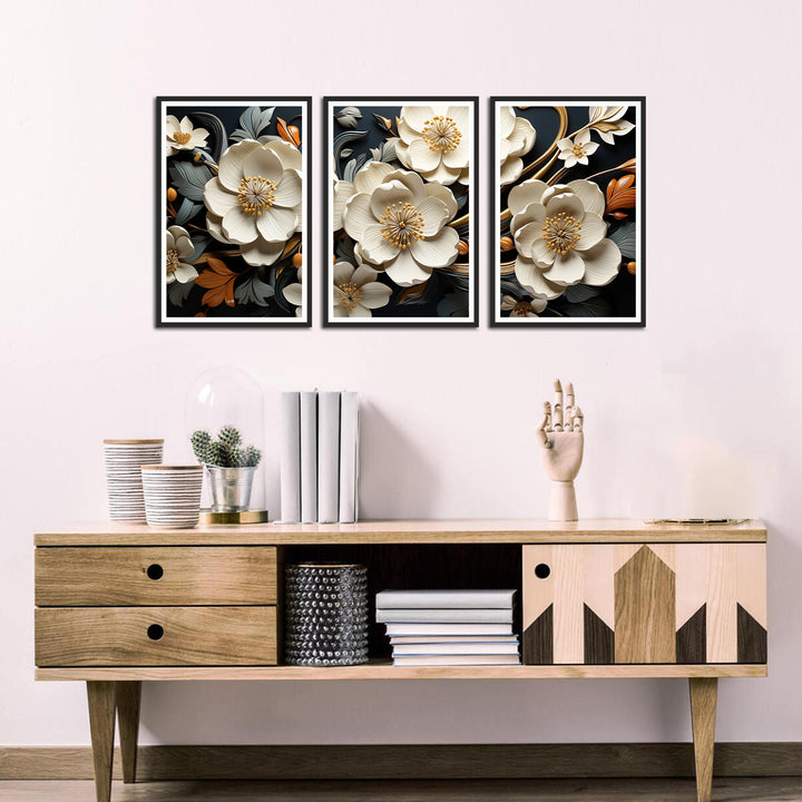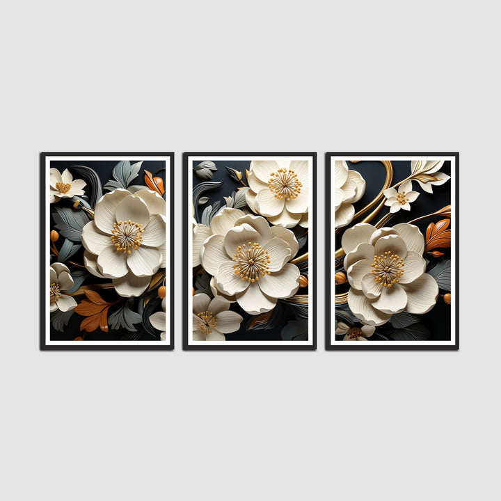 The collection of wall decor that celebrates the timeless beauty of white flowers. Each frame in this set features a unique and artistic arrangement of white blooms, meticulously crafted to capture their purity, elegance, and delicate allure.The soft and neutral color palette of white adds a touch of sophistication, purity, and tranquility to any room. The white flowers create a sense of freshness, purity, and serenity, making these frames perfect for enhancing the ambiance of bedrooms, living rooms, or even office spaces.