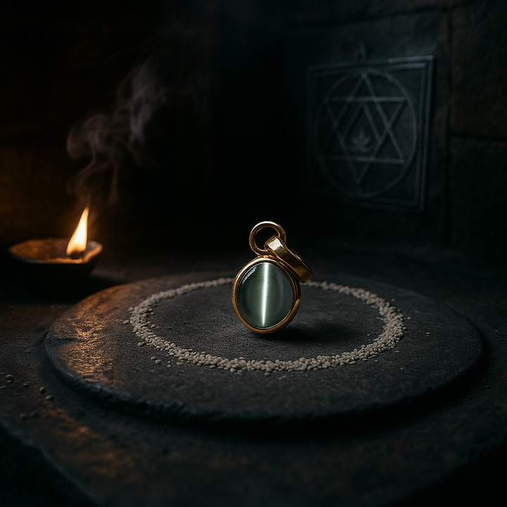 Set in sacred Panchdhatu with a luxurious gold-plated finish, the pendant is thoughtfully made with an open-back setting so the stone touches the skin directly, allowing uninterrupted transmission of its metaphysical energy. The Cat’s Eye stone is linked with protection, focus, and karmic cleansing, and is especially beneficial for those on a spiritual path, in fields like programming, yoga, or research.
