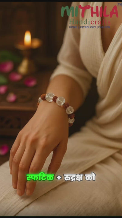 The MithilaShri Dhan Samriddhi Kavach Bracelet is a sacred combination of Sphatik (Quartz Crystal) and Rudraksha, traditionally revered in Vedic and spiritual practices. According to shastras, Sphatik is associated with purity, mental clarity, and aura balance, while Rudraksha is believed to support inner stability, discipline, and focused energy. Together, they are traditionally worn to support a balanced mindset, calm decision-making, and a positive approach toward life and work. This bracelet is handcrafted and prepared as per traditional methods, making it suitable for those who follow belief-based spiritual practices.
