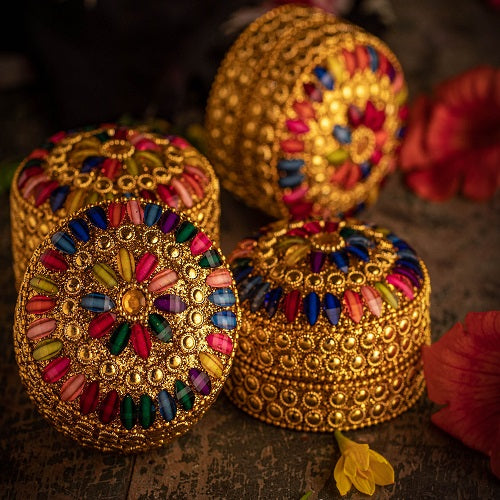 "These beautiful jeweled trinket boxes with a lid are handcrafted with jeweled, multi-color gemstones and golden decorations.