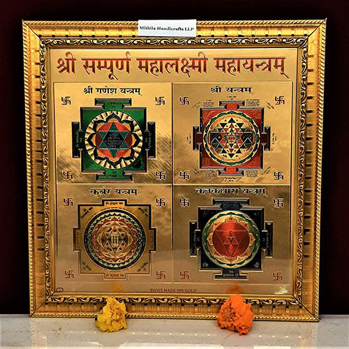 Mahalakshmi Yantra, one of the hindu spiritual products is said to be extremely beneficial and can help fulfill all your worldly desires. Since Sampurn means 'Complete' Shree Sampurn Mahalakshmi Yantra has all Yantras, which are used to appease Goddess Laxmi, it is very powerful and auspicious yantra for attaining worldly desires and fulfilling all wishes. The following yantras are included in this Shri Sampurna Mahalakshmi Mahayantra :- Shri Ganesh Yantra. Shri Yantra. Shri Kuber Yantra. Shri Kanakdhara Yantra. You can place this yantra in the cash box, safe, purse or even in your mandir. this yantra made with traditional design and Swiss made 24k gold plated. it can be place in mandir or hang on wall. Size of this yantra 27 Cm lenght, 27Cm Widh and 1.5 cm Hight. Mithila providing good and original product around the world.