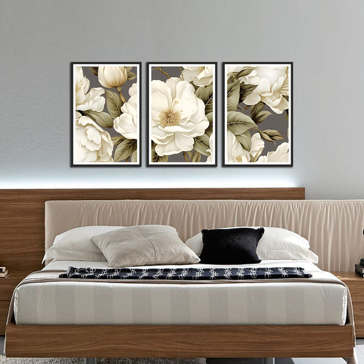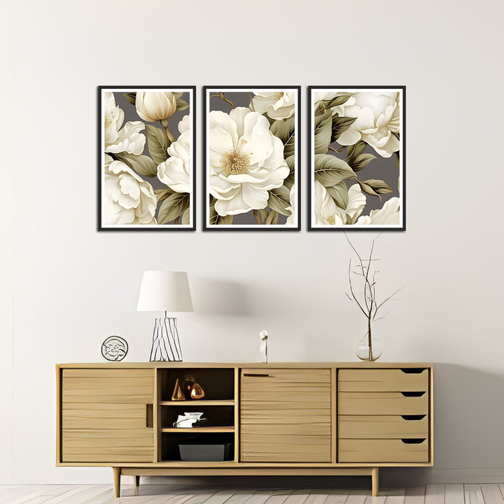 White Rose Flower Floating Canvas Wall Painting Set of Three