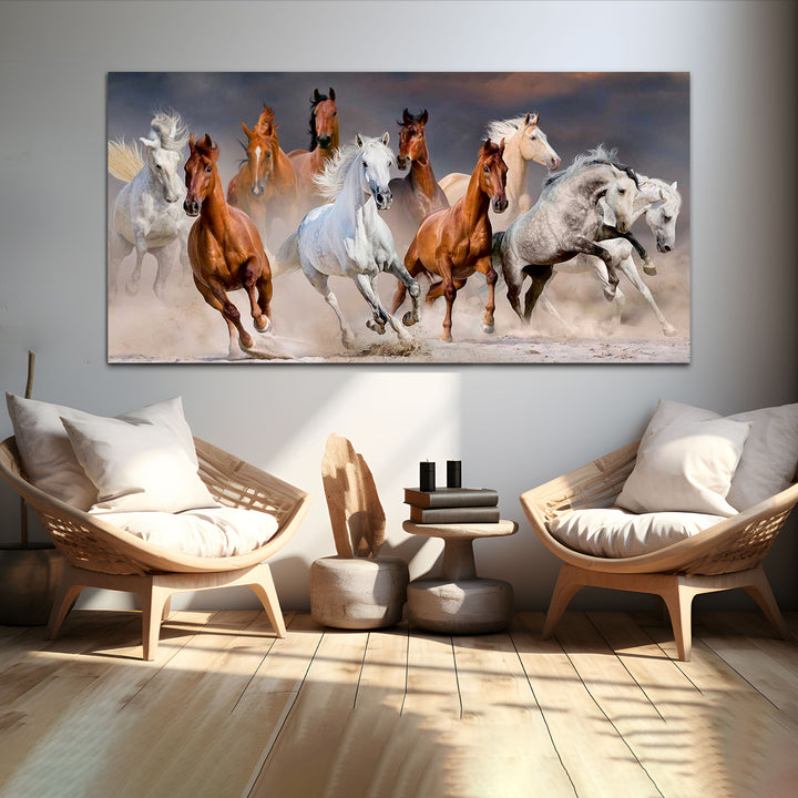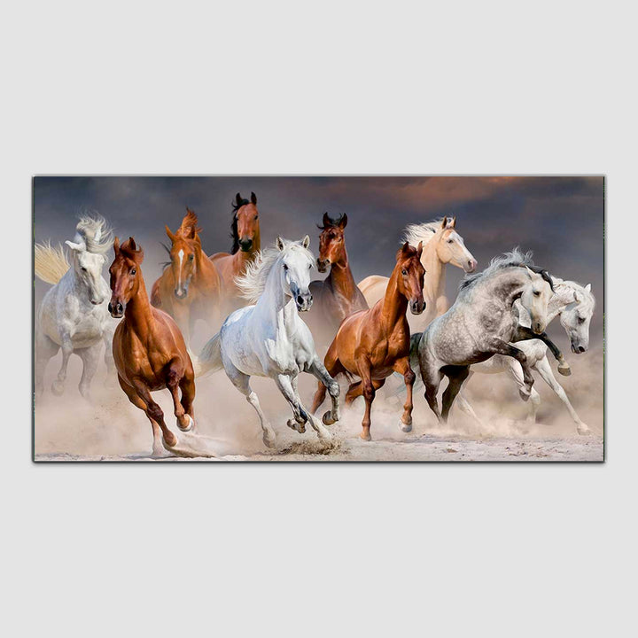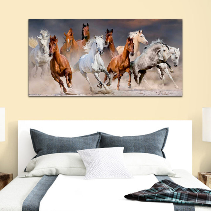 A running horse wall painting captures the essence of freedom, strength, and grace in motion. The scene unfolds with dynamic energy as the horse gallops across the canvas, its muscles rippling with power and determination. Each stroke of the artist's brush brings the majestic creature to life, conveying a sense of fluidity and speed. The horse's mane billows behind it like a banner unfurled in the wind, adding to the sense of movement and vitality. Its hooves kick up dust and dirt, leaving a trail of swirling particles in its wake. The background may be a sweeping landscape, suggesting vast open spaces and endless possibilities.