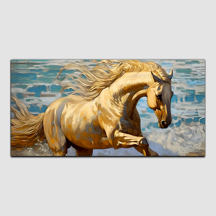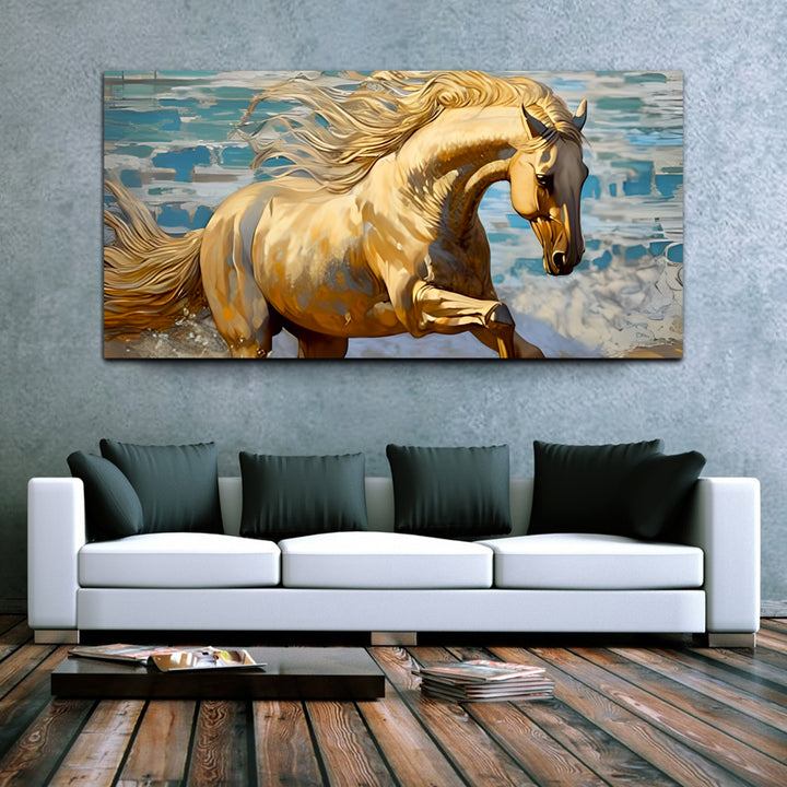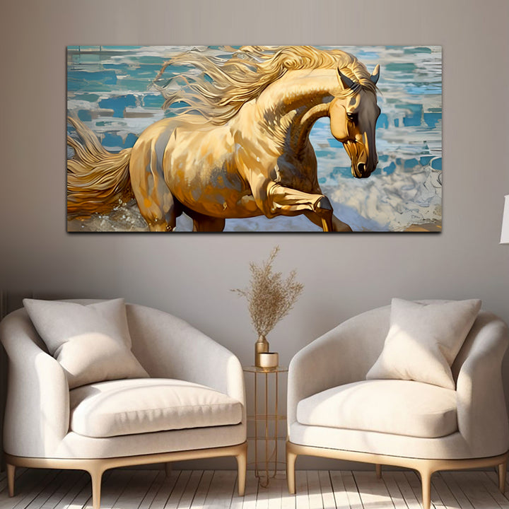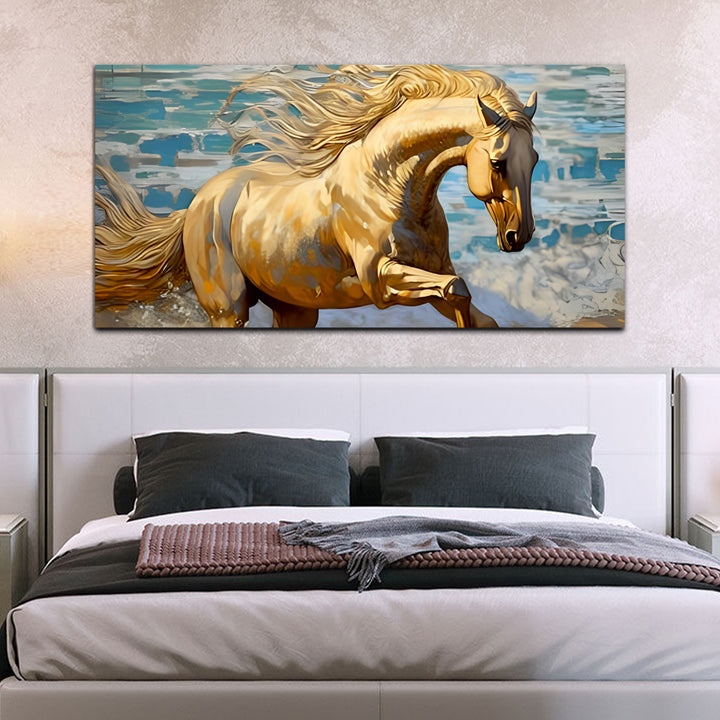 A running horse wall painting captures the essence of freedom, strength, and grace in motion. The scene unfolds with dynamic energy as the horse gallops across the canvas, its muscles rippling with power and determination. Each stroke of the artist's brush brings the majestic creature to life, conveying a sense of fluidity and speed. The horse's mane billows behind it like a banner unfurled in the wind, adding to the sense of movement and vitality. Its hooves kick up dust and dirt, leaving a trail of swirling particles in its wake. This painting are perfectally used for living room, bedroom, kitchen, office, Hotel, dining room, office.