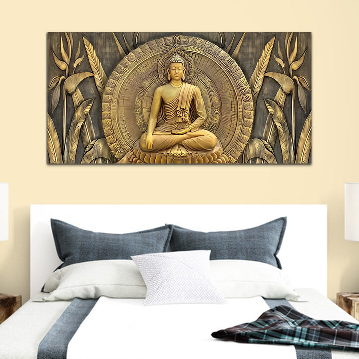 Lord Buddha wall painting emanates a sense of divine radiance and spiritual majesty. The golden hue symbolizes enlightenment, purity, and the transcendence of worldly concerns. Lord Buddha, depicted in a serene and dignified posture, exudes an aura of tranquility and wisdom, with his eyes closed or gently gazing downward in deep meditation.