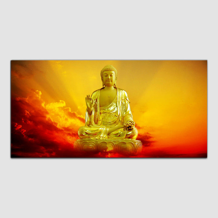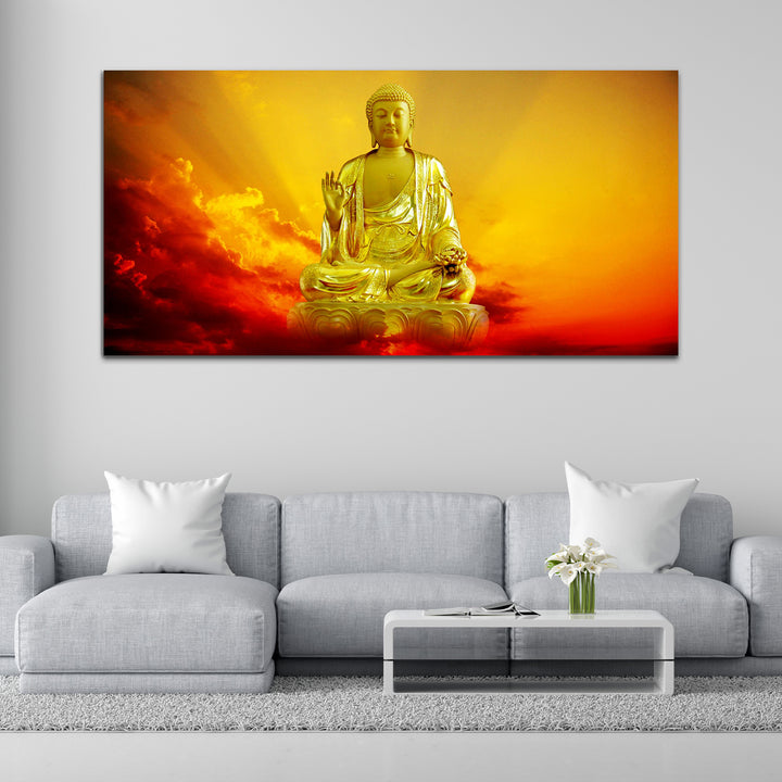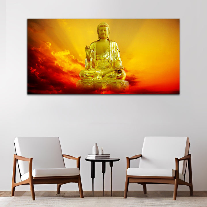Buddha religious art wall painting, where the golden glow of enlightenment beckons, guiding you towards a realm of profound tranquility and spiritual awakening. The golden hue symbolizes enlightenment, purity, and the transcendence of worldly concerns. Lord Buddha, depicted in a serene and dignified posture, exudes an aura of tranquility and wisdom, with his eyes closed or gently gazing downward in deep meditation.