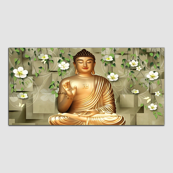 Lord Buddha wall painting emanates a sense of divine radiance and spiritual majesty. The golden hue symbolizes enlightenment, purity, and the transcendence of worldly concerns. Lord Buddha, depicted in a serene and dignified posture, exudes an aura of tranquility and wisdom, with his eyes closed or gently gazing downward in deep meditation. This painting are perfectally used for living room, bedroom, kitchen, office, Hotel, dining room, office.