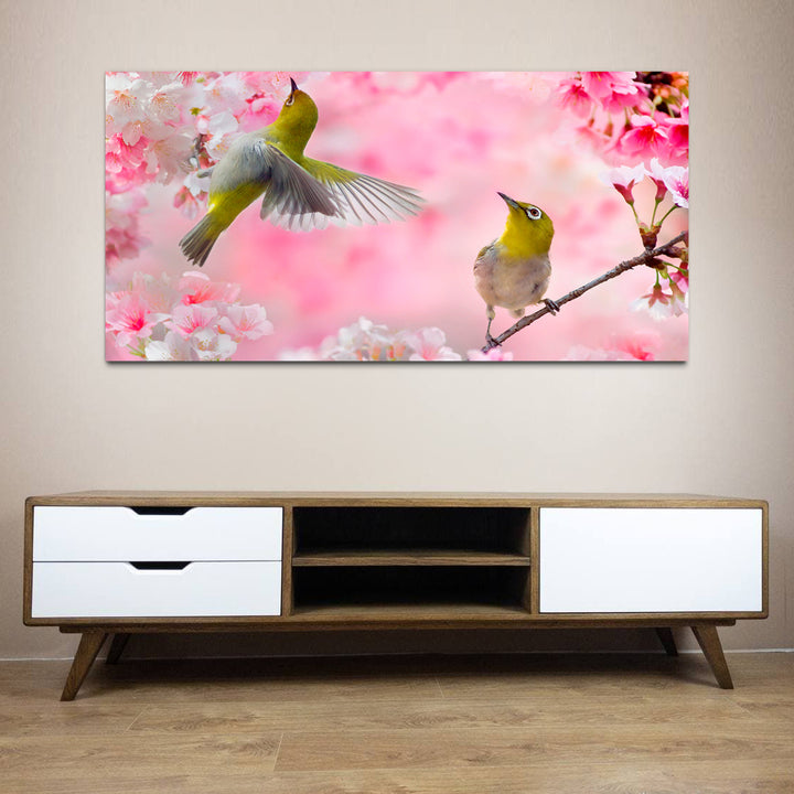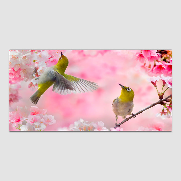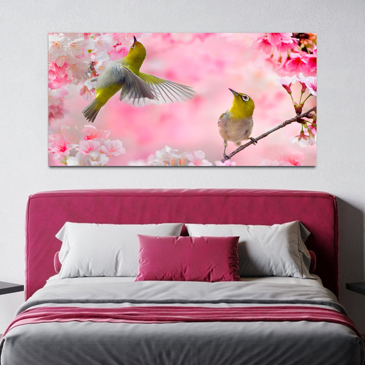 Two Beautiful Yellow Birds with Pink Flower Canvas Wall Painting
