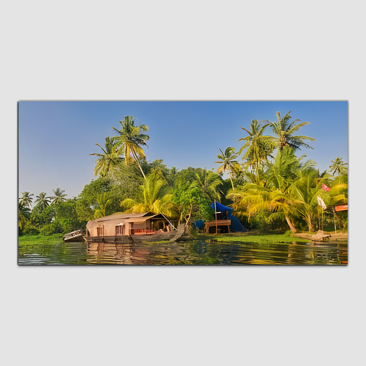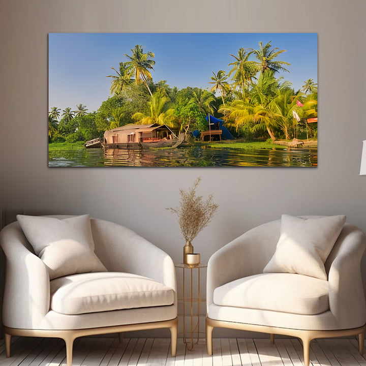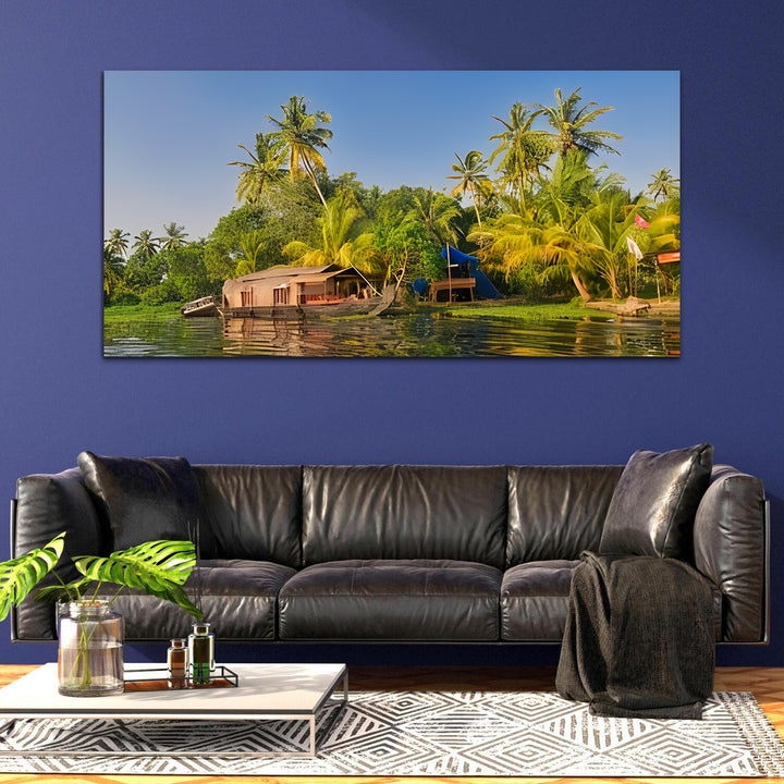 Green House Boat in the Backwaters of Kerala Canvas Art Wall Painting