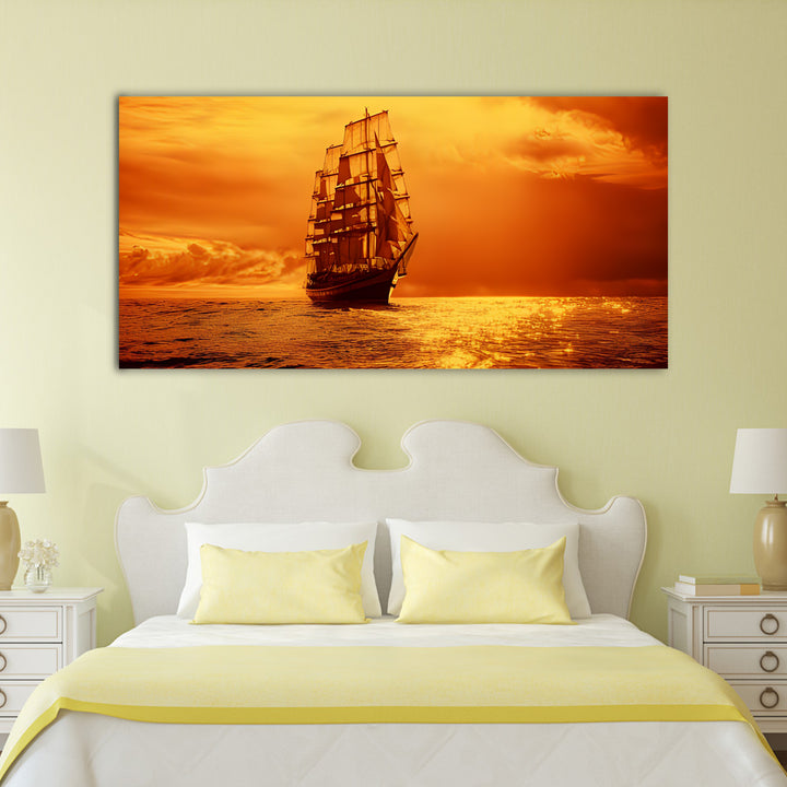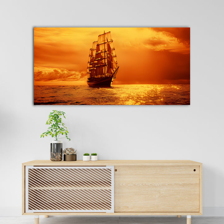A sailing ship in a beautiful golden sunset canvas art wall painting captures the timeless allure of maritime adventure against the backdrop of a breathtaking evening sky. The painting features a majestic sailing ship with billowing sails, gracefully navigating through calm waters under the warm glow of a golden sunset.The sky is painted in hues of gold, orange, and yellow, creating a mesmerizing and vibrant atmosphere that radiates warmth and tranquility. Wispy clouds may be scattered across the sky, catching the last rays of sunlight and adding a sense of movement and drama to the scene.