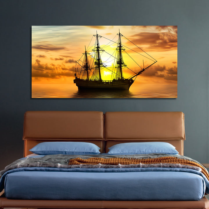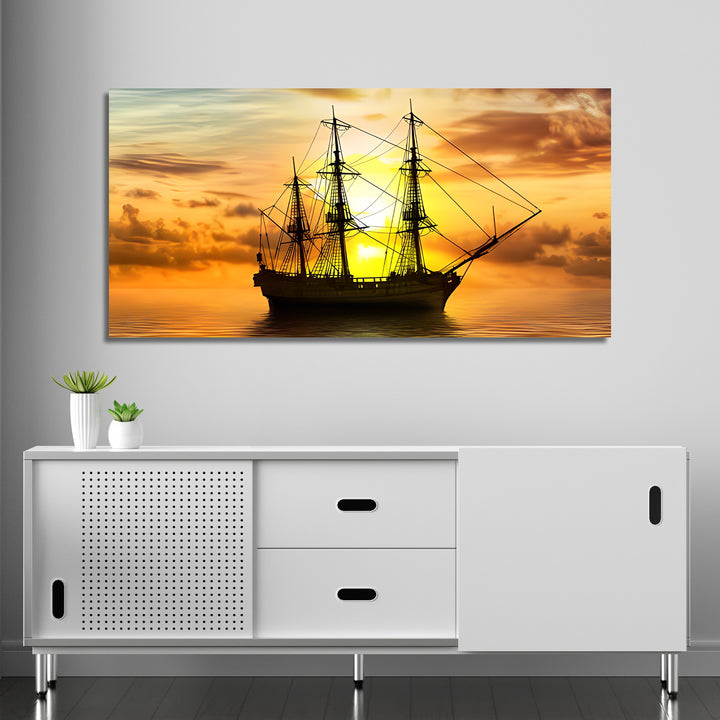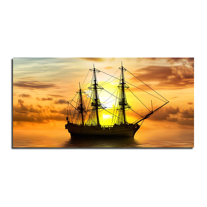 A sailing ship in a beautiful golden sunset canvas art wall painting captures the timeless allure of maritime adventure against the backdrop of a breathtaking evening sky. The painting features a majestic sailing ship with billowing sails, gracefully navigating through calm waters under the warm glow of a golden sunset.The sky is painted in hues of gold, orange, and yellow, creating a mesmerizing and vibrant atmosphere that radiates warmth and tranquility. Wispy clouds may be scattered across the sky, catching the last rays of sunlight and adding a sense of movement and drama to the scene.