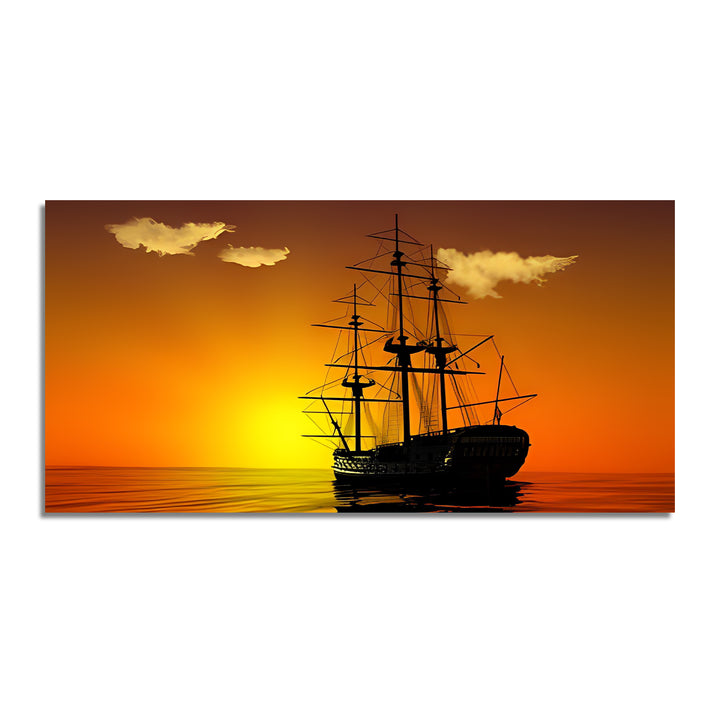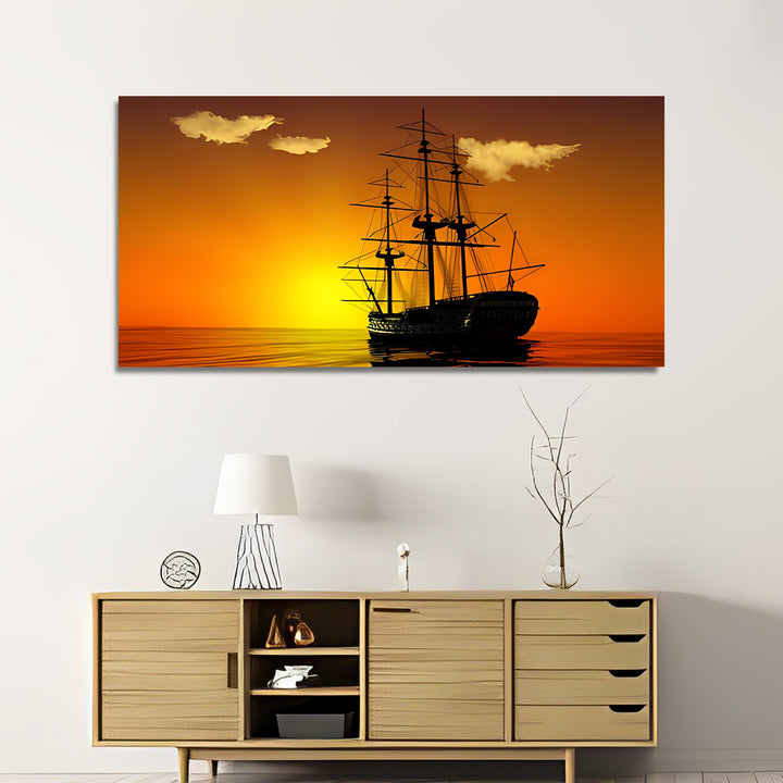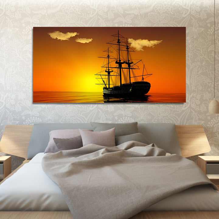 A beautiful sunrise with a boat over water wall painting captures the serene and picturesque moment of a new day beginning on the water. The painting depicts a stunning sunrise, with the sky painted in soft pastel colors of orange, pink, and purple, casting a warm glow over the scene. The calm water reflects the colors of the sky, creating a mirror-like effect that enhances the beauty of the sunrise.