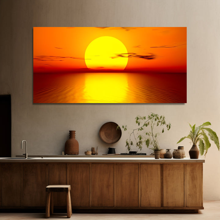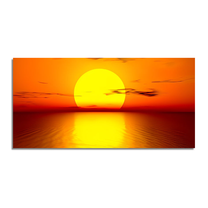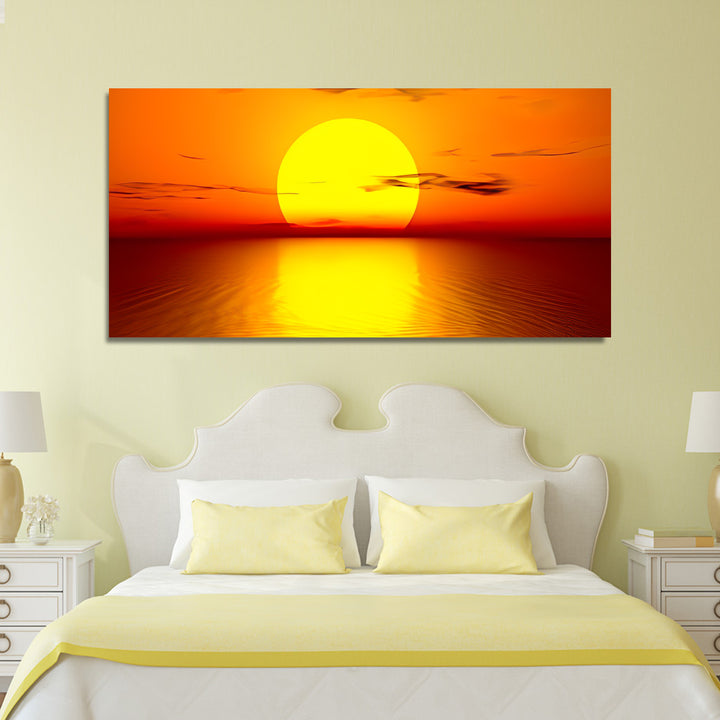 A sunset over ocean canvas wall painting captures the breathtaking beauty of a tranquil evening by the sea, as the sun dips below the horizon in a blaze of colors. The painting features a vivid and vibrant sunset sky, painted in rich hues of orange, pink, purple, and gold, creating a mesmerizing and dramatic backdrop.The reflection of the sunset on the calm waters of the ocean adds depth and intensity to the scene, with the colors blending and intermingling to create a surreal and captivating effect.