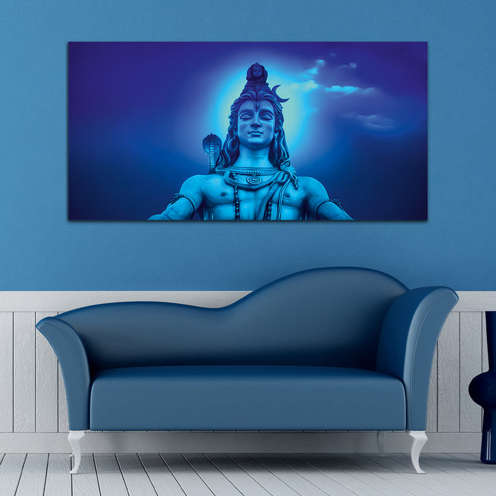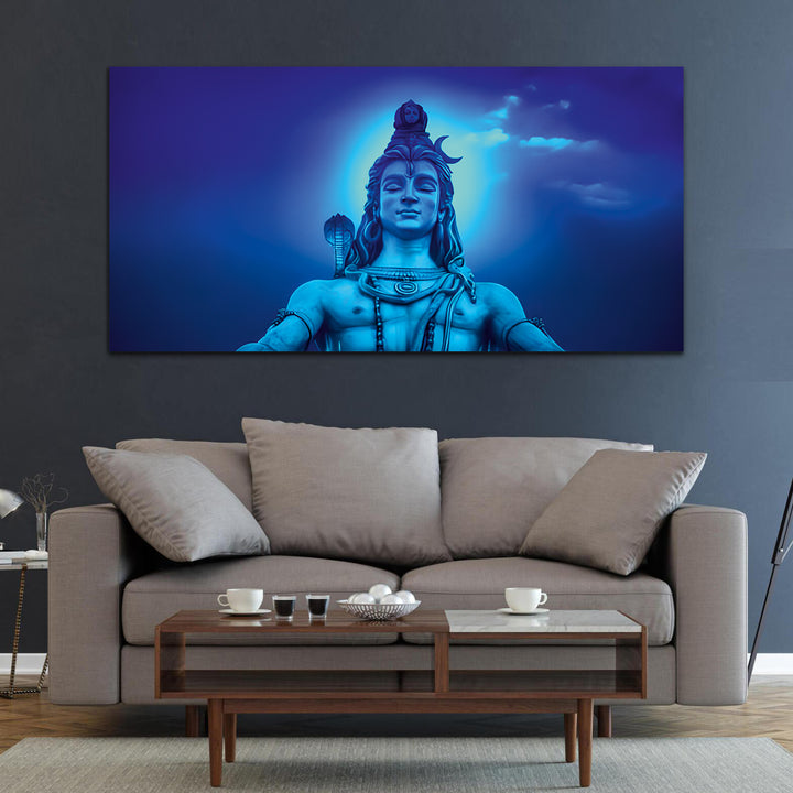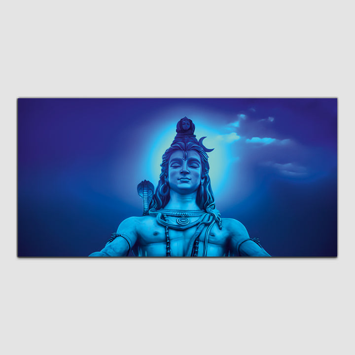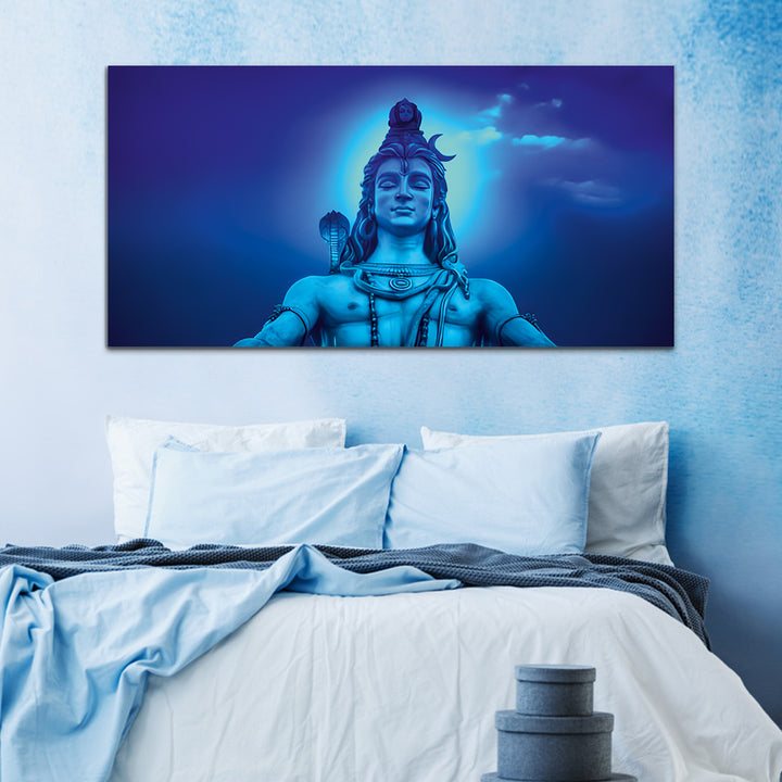 The Lord Shiva painting Capture the mystical essence of Lord Shiva with our exquisite canvas wall painting. Featuring vibrant colors and intricate detailing, this artwork beautifully portrays the divine presence of the destroyer and creator of worlds. Perfect for adorning your home or sacred space, it serves as a timeless reminder of Shiva's serene strength and spiritual grace.The intricate depiction of Shiva's iconic attributes, such as the trishula (trident) representing the three aspects of existence – creation, preservation, and destruction, and the damaru (drum) symbolizing the rhythm of the cosmos, adds layers of symbolism and depth to the artwork.This painting are perfectally used for living room, bedroom, kitchen, office, Hotel, dining room, office.
