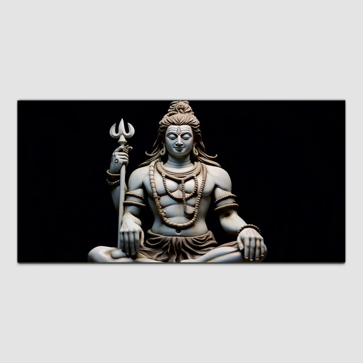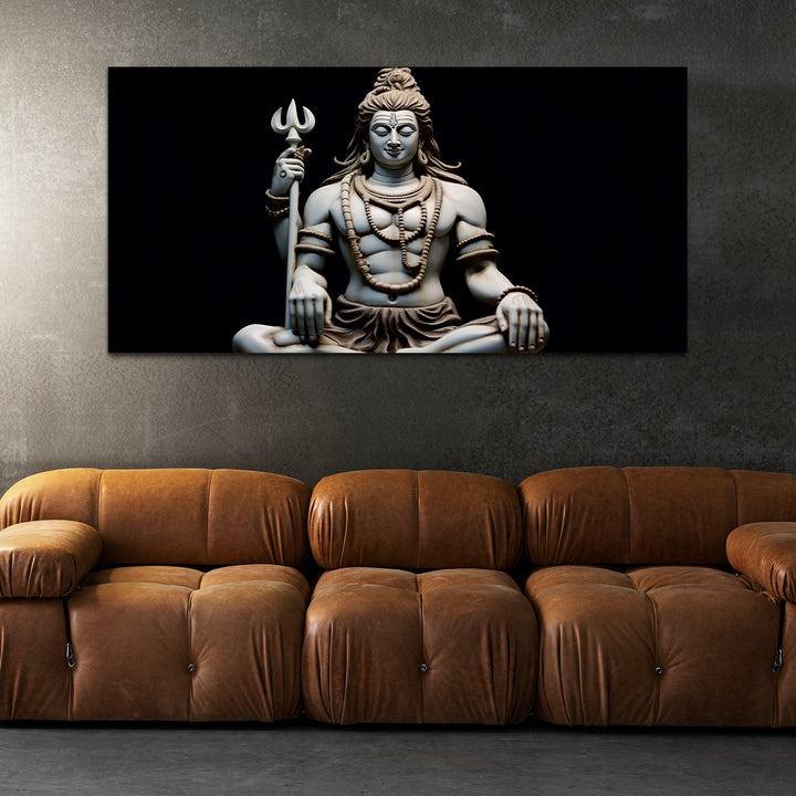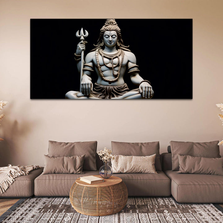 The Lord Shiva painting Capture the mystical essence of Lord Shiva with our exquisite canvas wall painting. Featuring vibrant colors and intricate detailing, this artwork beautifully portrays the divine presence of the destroyer and creator of worlds. Perfect for adorning your home or sacred space, it serves as a timeless reminder of Shiva's serene strength and spiritual grace.The intricate depiction of Shiva's iconic attributes, such as the trishula (trident) representing the three aspects of existence – creation, preservation, and destruction, and the damaru (drum) symbolizing the rhythm of the cosmos, adds layers of symbolism and depth to the artwork.This painting are perfectally used for living room, bedroom, kitchen, office, Hotel, dining room, office.