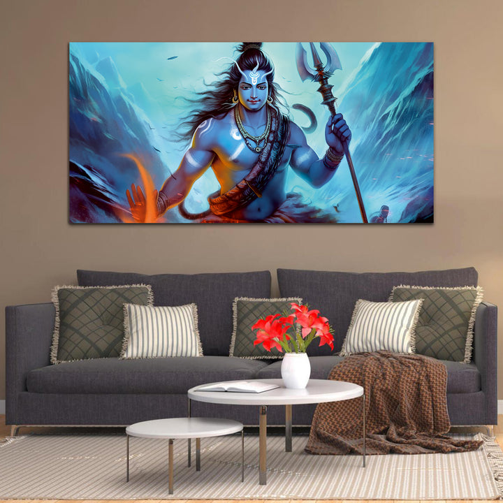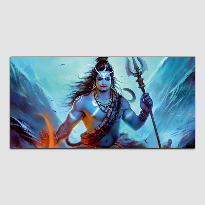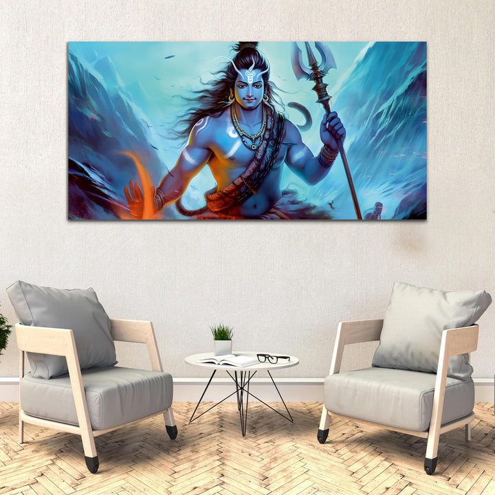 The Lord Shiva painting Capture the mystical essence of Lord Shiva with our exquisite canvas wall painting. Featuring vibrant colors and intricate detailing, this artwork beautifully portrays the divine presence of the destroyer and creator of worlds. Perfect for adorning your home or sacred space, it serves as a timeless reminder of Shiva's serene strength and spiritual grace.The intricate depiction of Shiva's iconic attributes, such as the trishula (trident) representing the three aspects of existence – creation, preservation, and destruction, and the damaru (drum) symbolizing the rhythm of the cosmos, adds layers of symbolism and depth to the artwork.This painting are perfectally used for living room, bedroom, kitchen, office, Hotel, dining room, office.