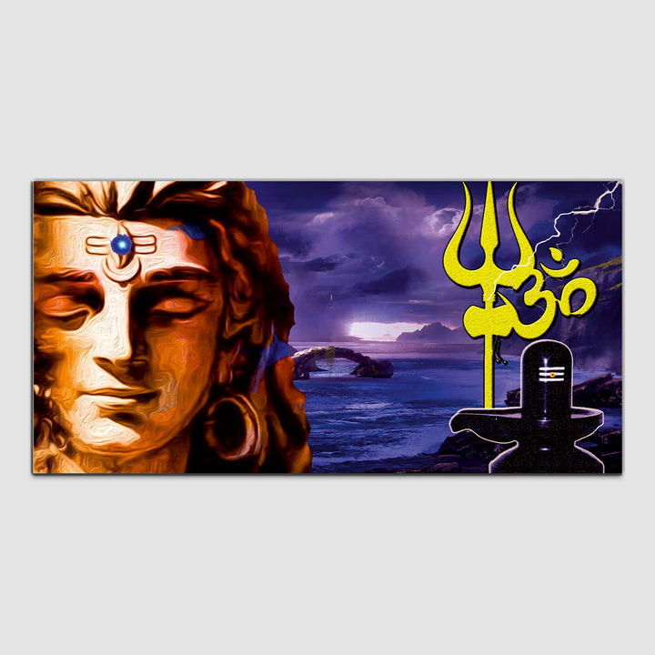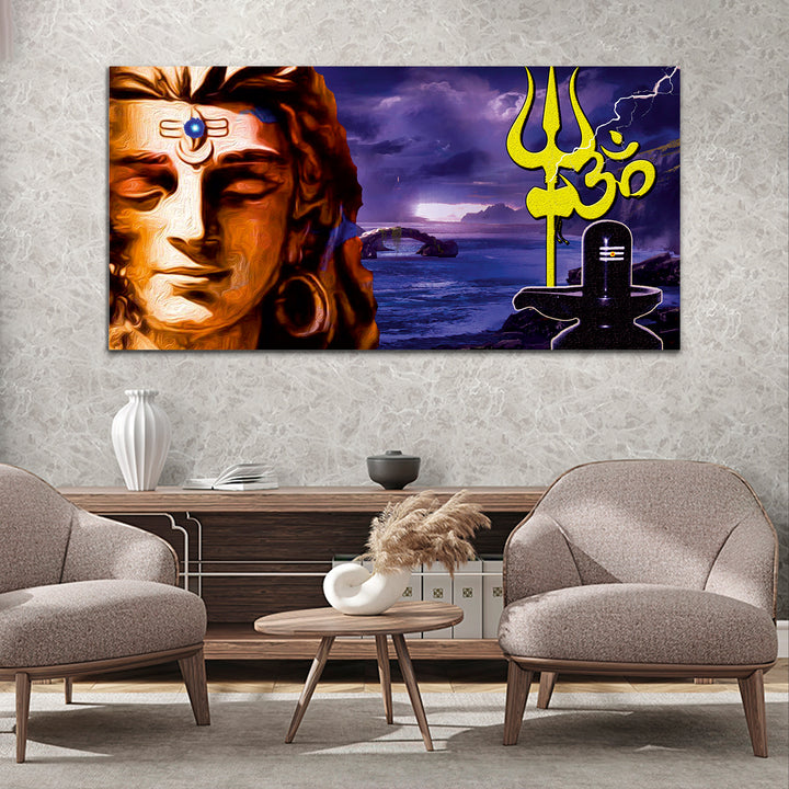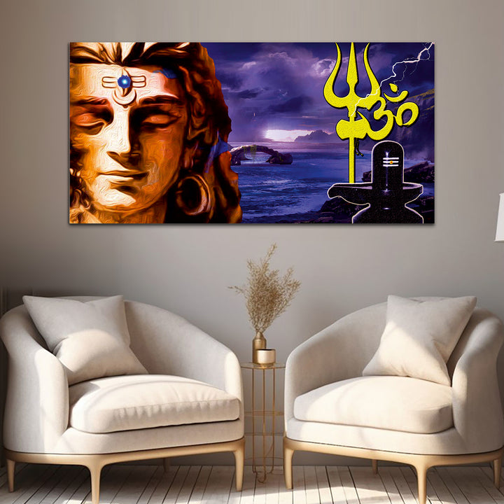The Lord Shiva painting Capture the mystical essence of Lord Shiva with our exquisite canvas wall painting. Featuring vibrant colors and intricate detailing, this artwork beautifully portrays the divine presence of the destroyer and creator of worlds. Perfect for adorning your home or sacred space, it serves as a timeless reminder of Shiva's serene strength and spiritual grace.The intricate depiction of Shiva's iconic attributes, such as the trishula (trident) representing the three aspects of existence – creation, preservation, and destruction, and the damaru (drum) symbolizing the rhythm of the cosmos, adds layers of symbolism and depth to the artwork.This painting are perfectally used for living room, bedroom, kitchen, office, Hotel, dining room, office.