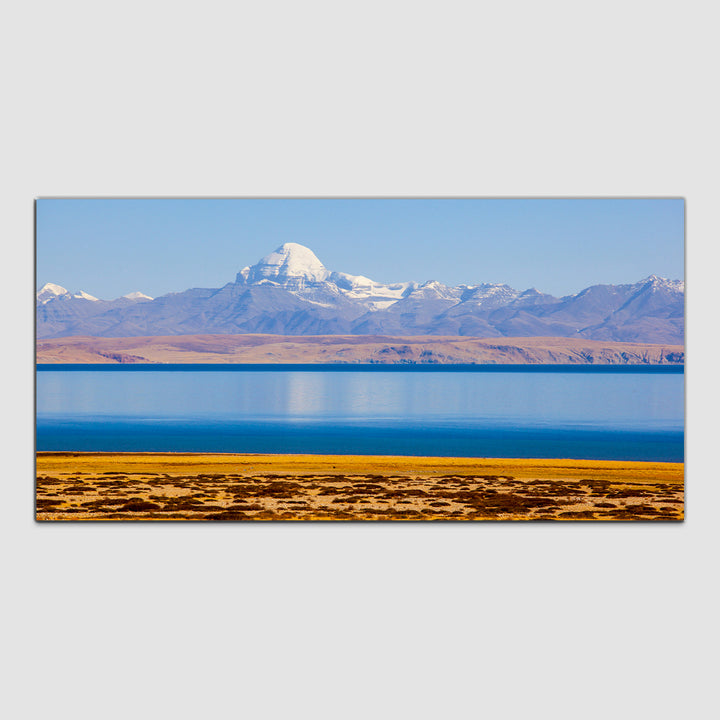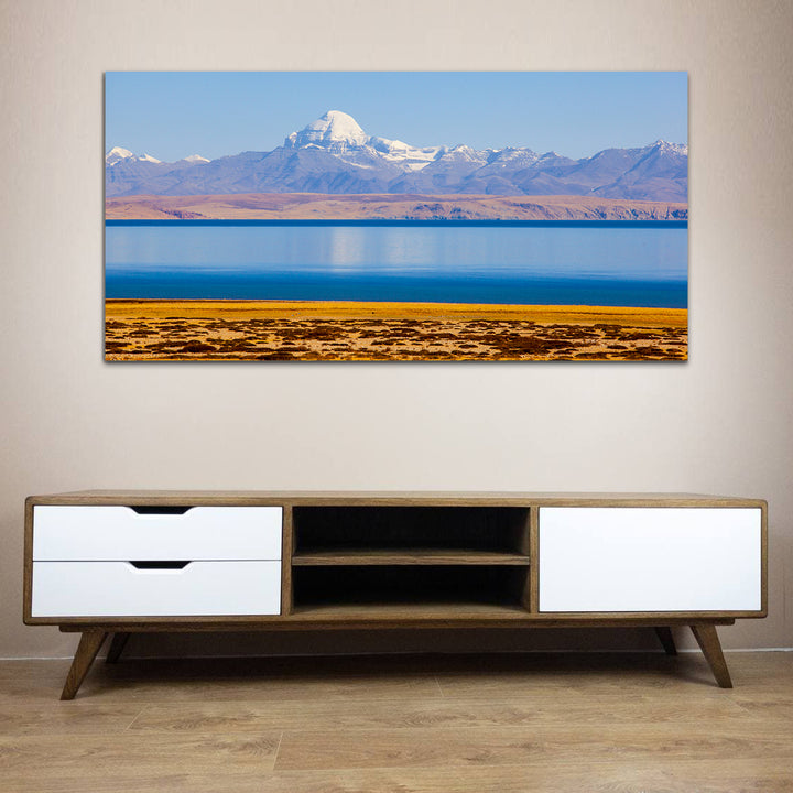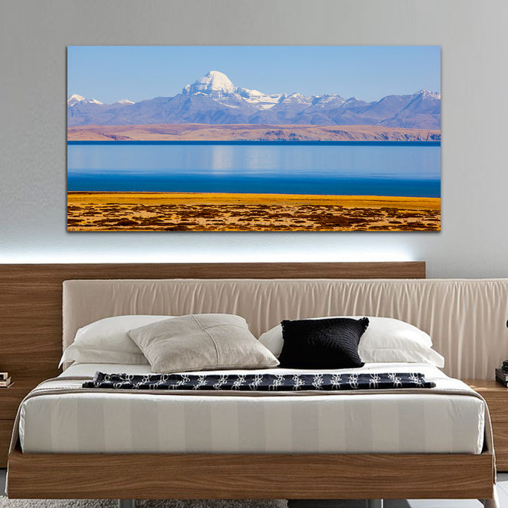 The canvas wall painting depicting a breathtaking mountain landscape overlooking a tranquil lake. Vibrant hues blend seamlessly to evoke the awe-inspiring beauty of the natural world, inviting viewers to immerse themselves in the peaceful ambiance of the scene. With each brushstroke, the rugged grandeur of the mountains and the serene calm of the reflective waters come to life, infusing any space with a sense of tranquility and wonderThis painting are perfectally used for living room,bedroom,kitchen, office, Hotel, dining room, office.