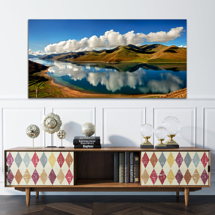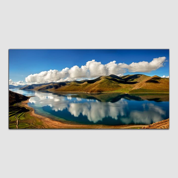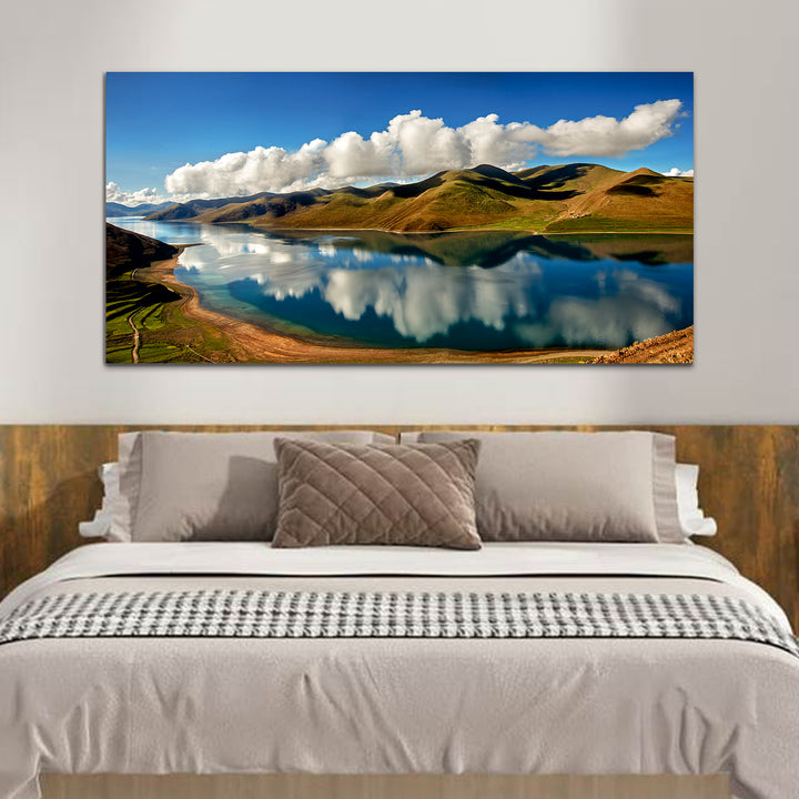 The canvas wall painting depicting a breathtaking mountain landscape overlooking a tranquil lake. Vibrant hues blend seamlessly to evoke the awe-inspiring beauty of the natural world, inviting viewers to immerse themselves in the peaceful ambiance of the scene. With each brushstroke, the rugged grandeur of the mountains and the serene calm of the reflective waters come to life, infusing any space with a sense of tranquility and wonderThis painting are perfectally used for living room,bedroom,kitchen, office, Hotel, dining room, office.