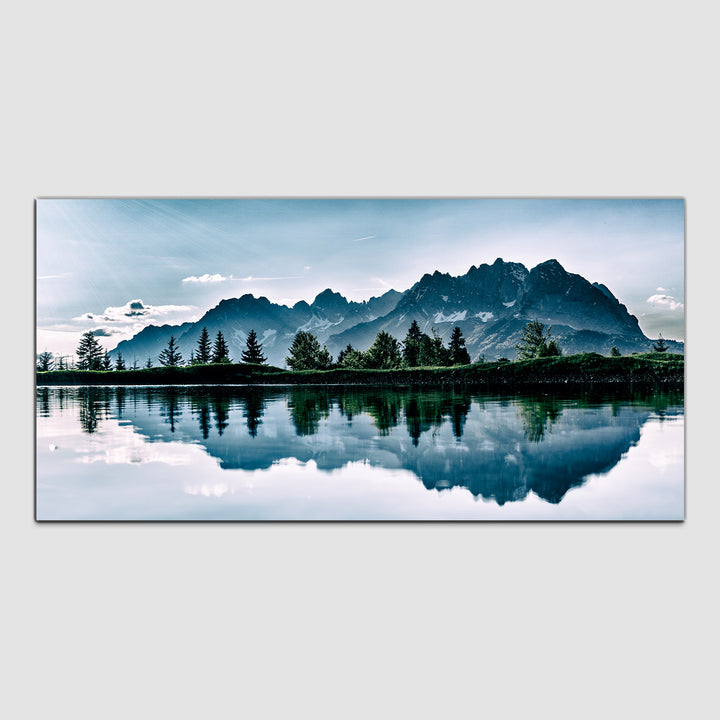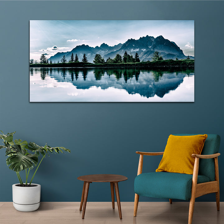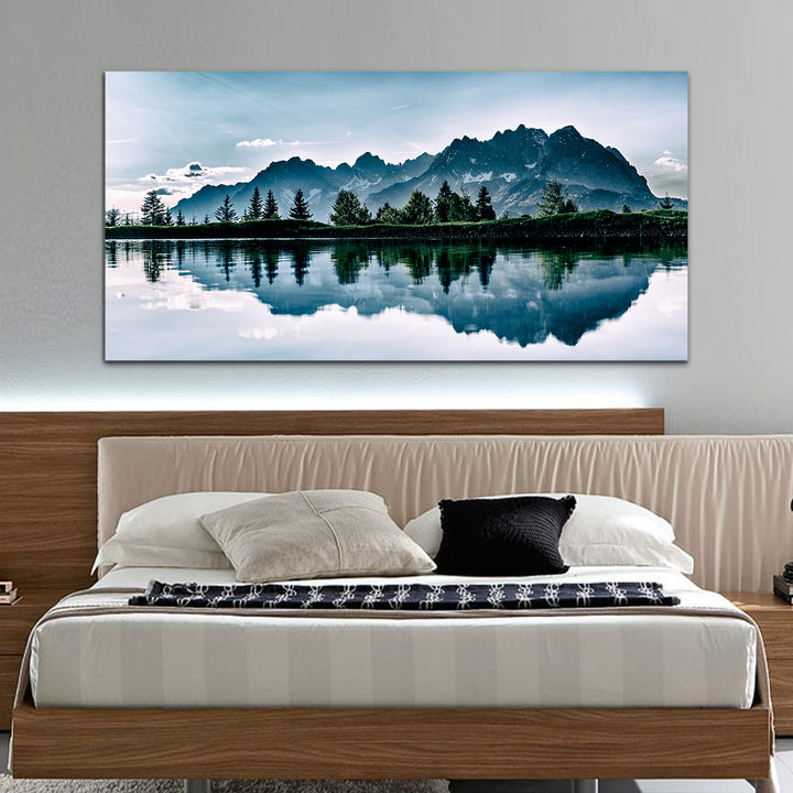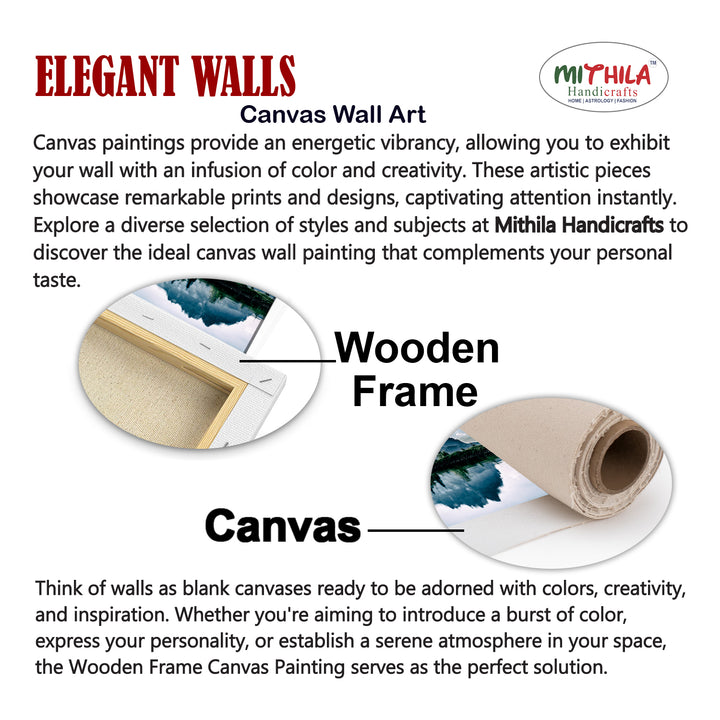 The canvas wall painting depicting a breathtaking mountain landscape overlooking a tranquil lake. Vibrant hues blend seamlessly to evoke the awe-inspiring beauty of the natural world, inviting viewers to immerse themselves in the peaceful ambiance of the scene. With each brushstroke, the rugged grandeur of the mountains and the serene calm of the reflective waters come to life, infusing any space with a sense of tranquility and wonderThis painting are perfectally used for living room,bedroom,kitchen, office, Hotel, dining room, office.
