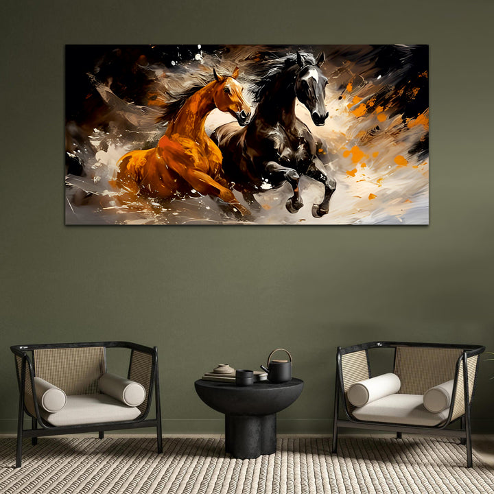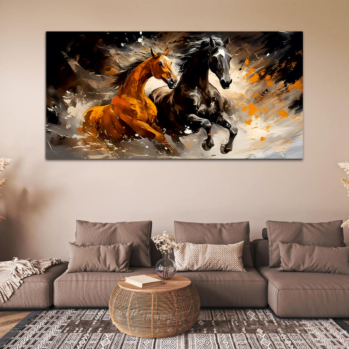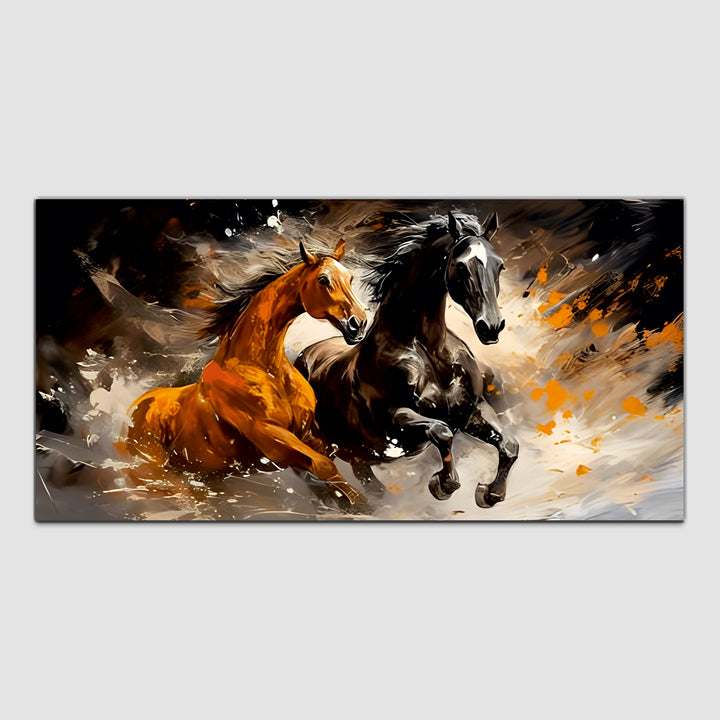 A running horse wall painting captures the essence of freedom, strength, and grace in motion. The scene unfolds with dynamic energy as the horse gallops across the canvas, its muscles rippling with power and determination. Each stroke of the artist's brush brings the majestic creature to life, conveying a sense of fluidity and speed. The horse's mane billows behind it like a banner unfurled in the wind, adding to the sense of movement and vitality. Its hooves kick up dust and dirt, leaving a trail of swirling particles in its wake. The background may be a sweeping landscape, suggesting vast open spaces and endless possibilities.