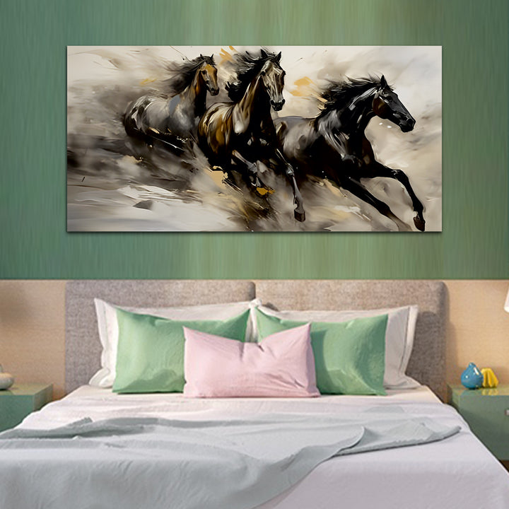 A running horse wall painting captures the essence of freedom, strength, and grace in motion. The scene unfolds with dynamic energy as the horse gallops across the canvas, its muscles rippling with power and determination. Each stroke of the artist's brush brings the majestic creature to life, conveying a sense of fluidity and speed. The horse's mane billows behind it like a banner unfurled in the wind, adding to the sense of movement and vitality. Its hooves kick up dust and dirt, leaving a trail of swirling particles in its wake. This painting are perfectally used for living room, bedroom, kitchen, office, Hotel, dining room, office.