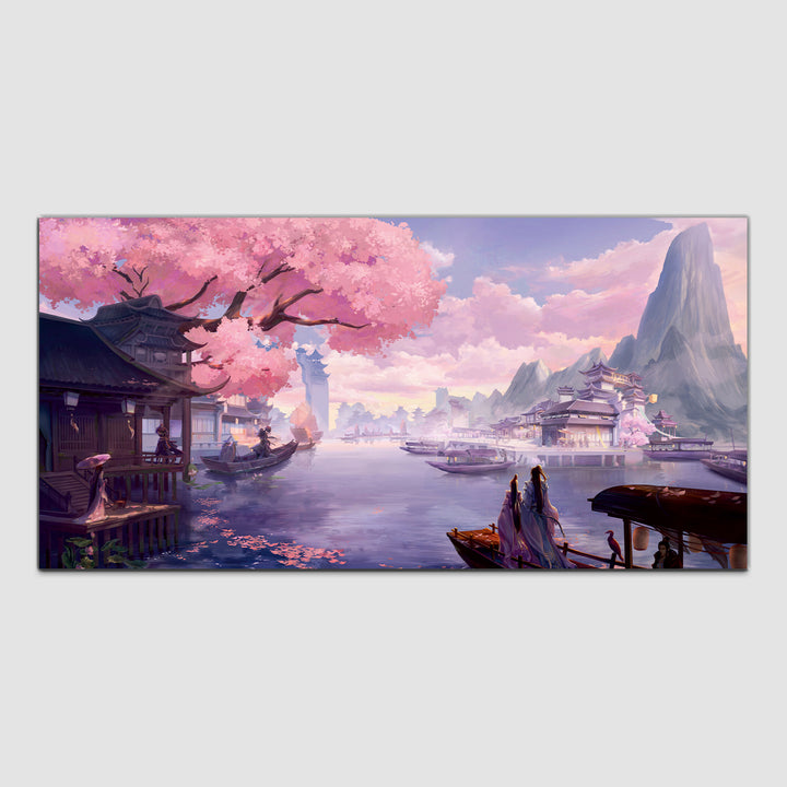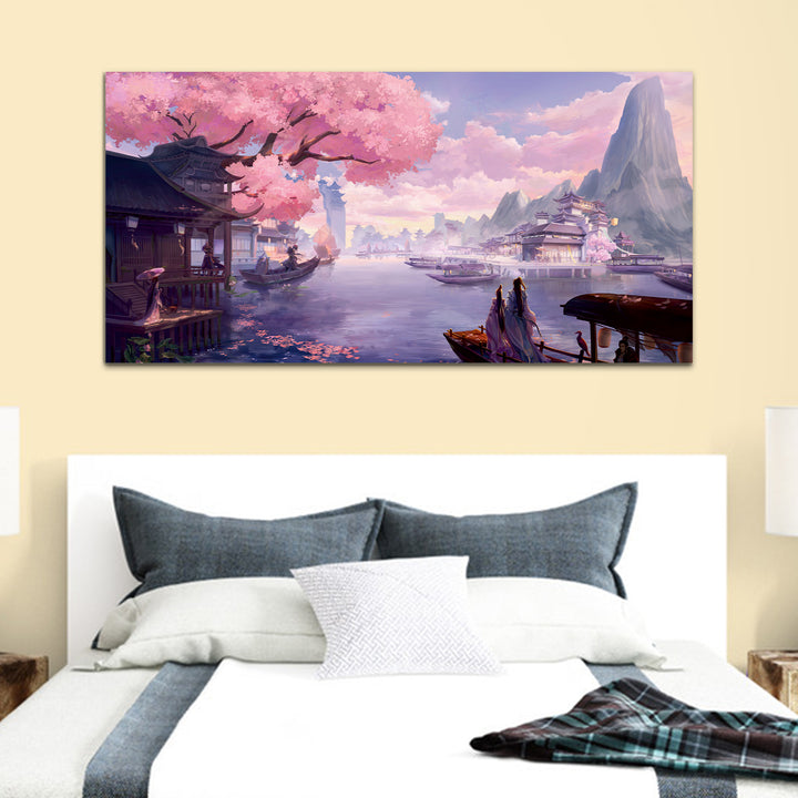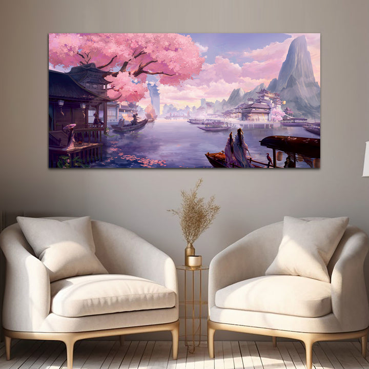 Beautiful Pink Tree with Mountain and River Canvas Wall Painting
