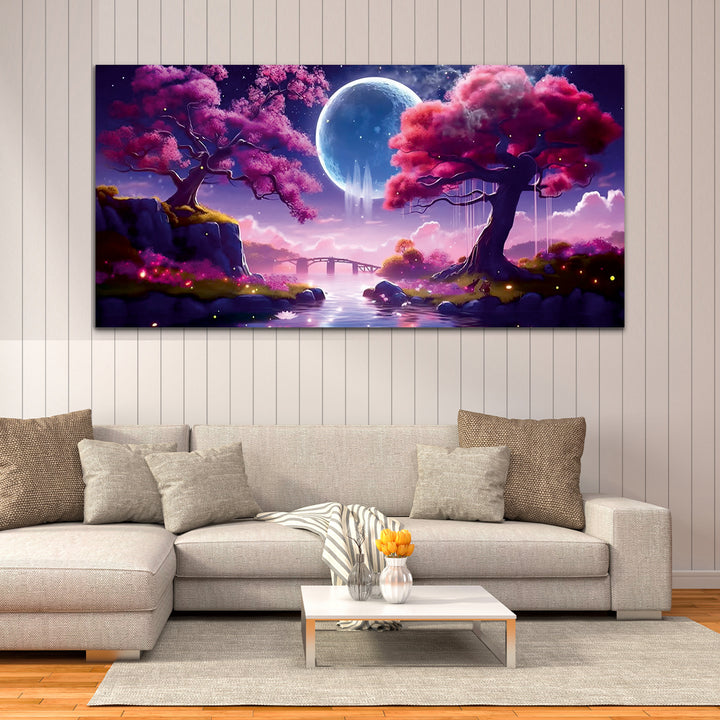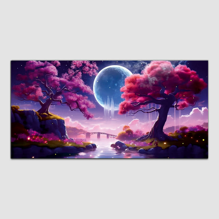 Beautiful Pink Forest Tree with Bridge Canvas Wall Painting