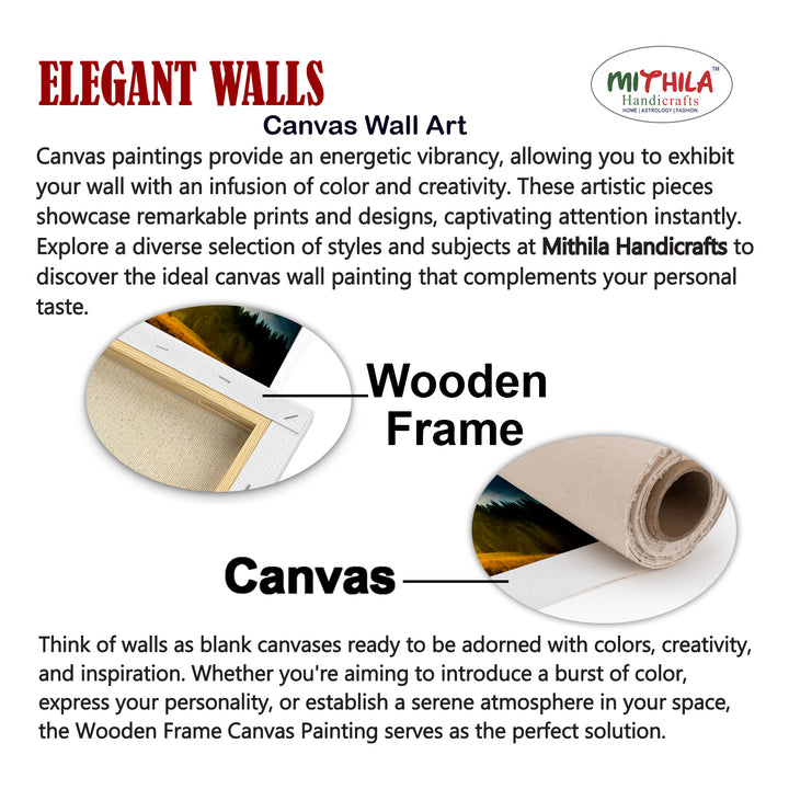 A beautiful Green Mountain and Forest Canvas Wall painting can be described as a serene and enchanting scene that captures the essence of nature's beauty. Imagine towering green mountains in the background, their peaks reaching towards the sky, surrounded by lush, dense forests teeming with life. The play of light and shadow on the trees creates a captivating interplay of colors, from deep emerald greens to soft shades of moss and fern.The composition could feature a winding river or stream meandering through the forest, reflecting the verdant landscape and adding a sense of tranquility to the scene. Sunlight filtering through the trees creates dappled patterns on the forest floor, enhancing the feeling of depth and dimension in the painting.This painting are perfectally used for living room, bedroom, kitchen, office, Hotel, dining room, office.