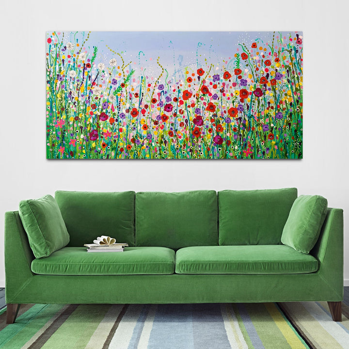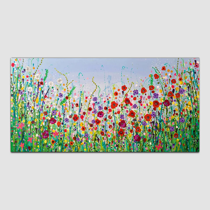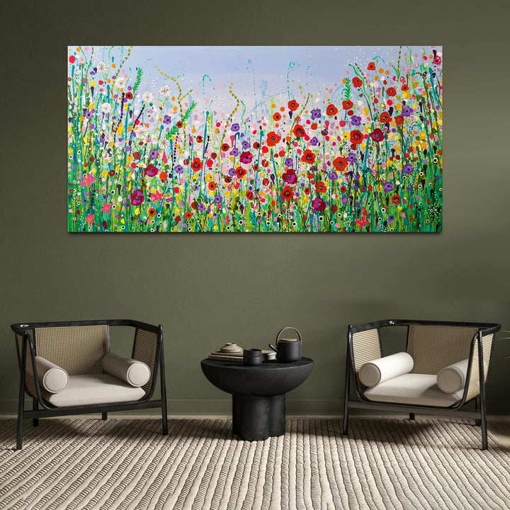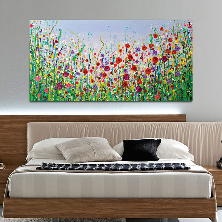 A colorful Flower Canvas Wall Painting and Arts can be described as a vibrant and lively depiction of various flowers in full bloom. Picture a canvas filled with a riot of colors, showcasing a garden or field of flowers in their natural beauty.The painting features a diverse array of flowers, from delicate roses in shades of pink, red, and white to cheerful sunflowers with their bright yellow petals. Other blooms like tulips, daisies, lilies, and peonies add a mix of colors such as purple, orange, blue, and cream, creating a harmonious and eye-catching composition.