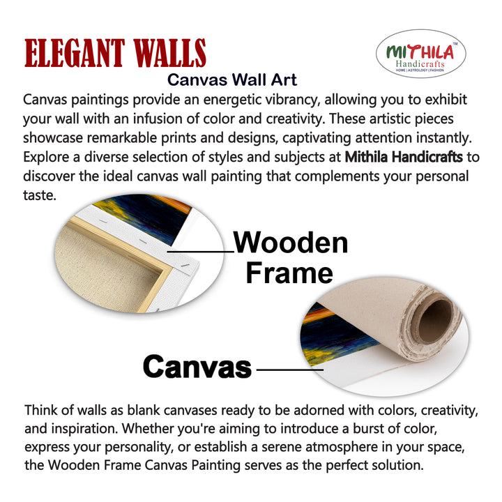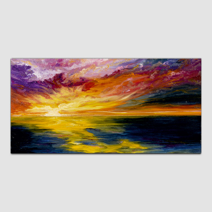 Beautiful Sunset and Boat under Water canvas wall painting captures the serene and enchanting moment when the sun dips below the horizon, casting a warm golden glow over the tranquil waters. The sky is painted in hues of orange, pink, and purple, creating a stunning contrast against the deep blue sea. Silhouettes of palm trees sway gently in the breeze, adding a touch of tropical paradise to the scene. The soft waves gently lapping against the shore complete the peaceful and mesmerizing ambiance of this coastal masterpiece.