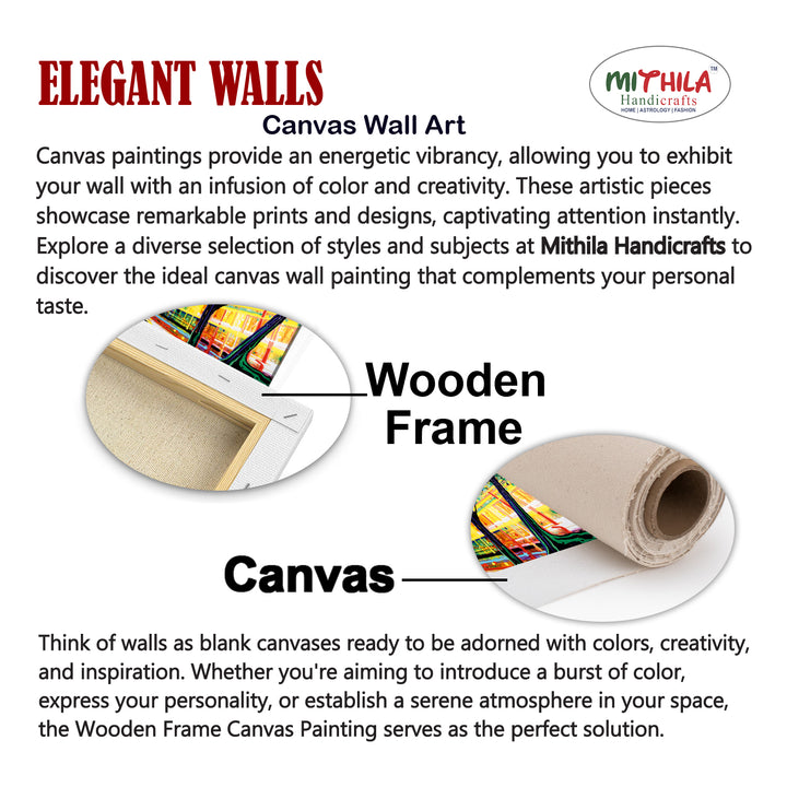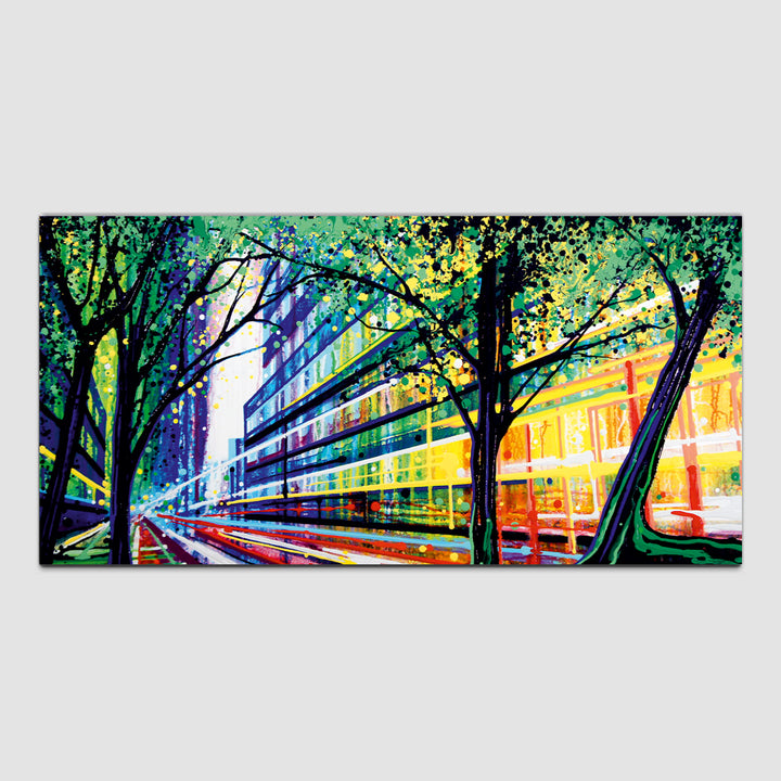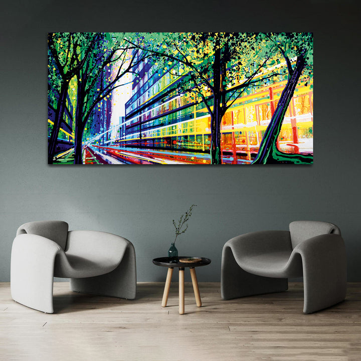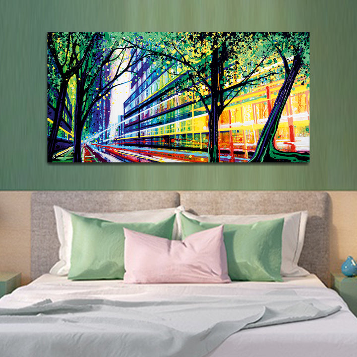 A beautiful abstract colorful street road with tree canvas wall painting is a captivating artwork that combines elements of urban and natural scenery in a creative and imaginative way. The painting features a vibrant street scene with a winding road lined with colorful buildings, streetlights, and vehicles. Tall, leafy trees add a touch of nature to the urban setting, their branches reaching towards the sky in a dynamic and artistic manner.This painting are perfectally used for living room, bedroom, kitchen, office, Hotel, dining room, office.