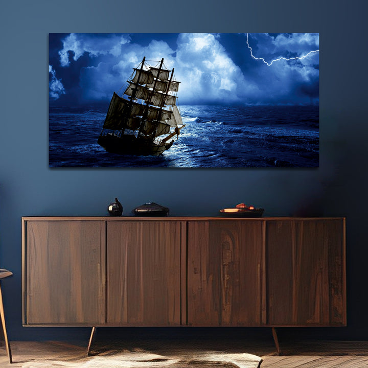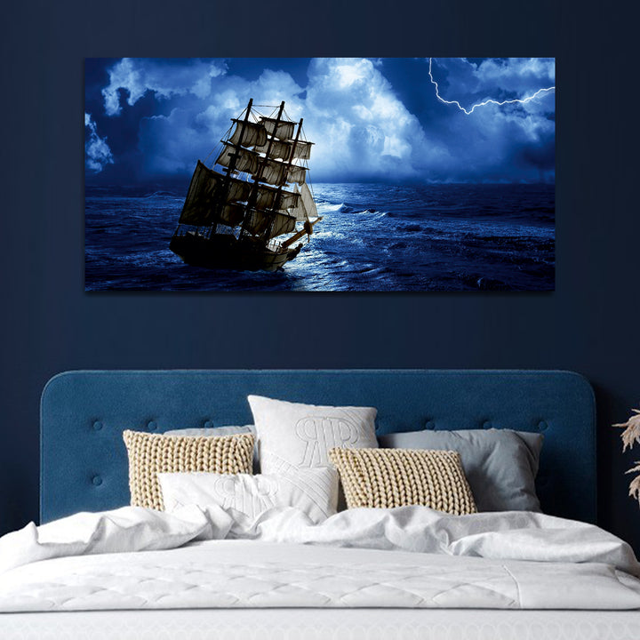 A boat under water with a blue sky wall painting is a serene and captivating artwork that combines elements of the underwater world with the beauty of a clear blue sky. The painting depicts a boat submerged beneath the surface of calm, crystal-clear waters, with sunlight filtering through to create mesmerizing patterns of light and shadows on the ocean floor.The colors used in the painting are predominantly shades of blue and turquoise for the water, creating a sense of tranquility and depth. This painting are perfectally used for living room, bedroom, kitchen, office, Hotel, dining room, office.