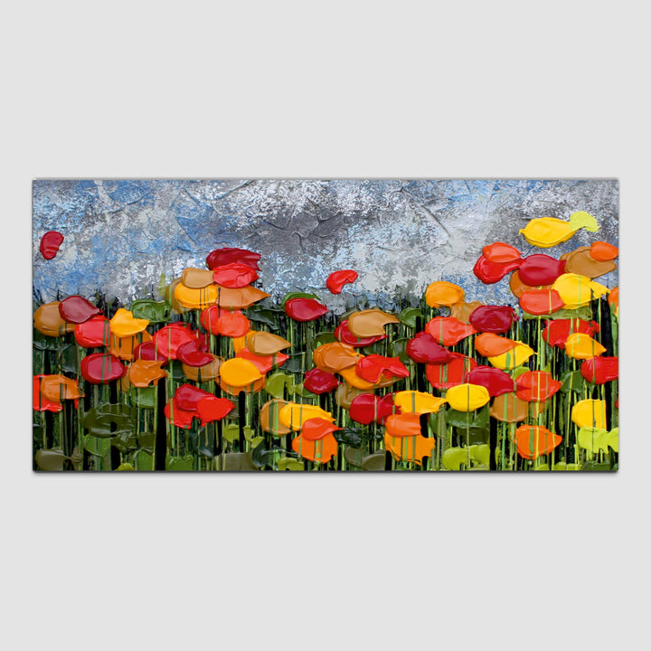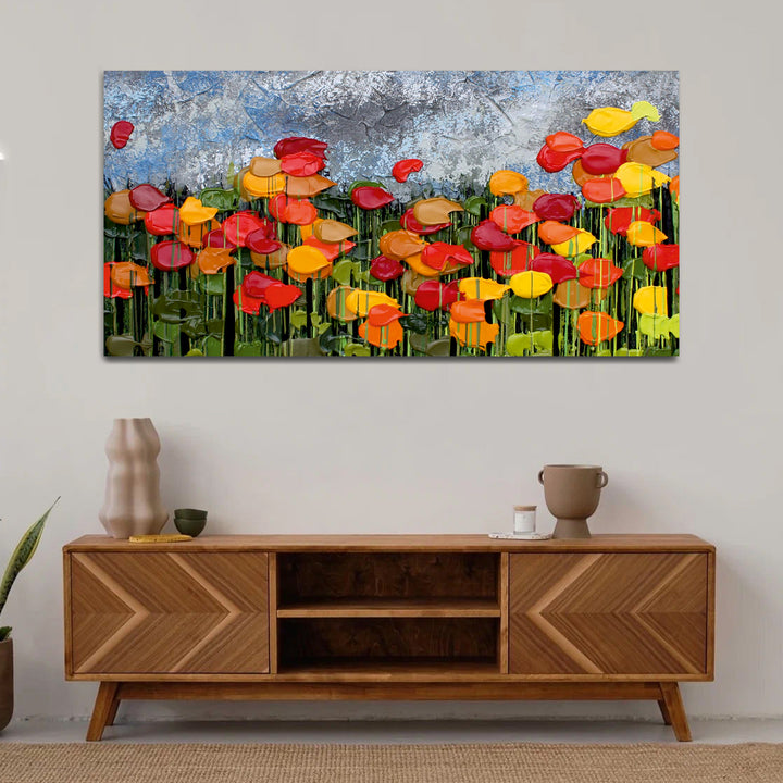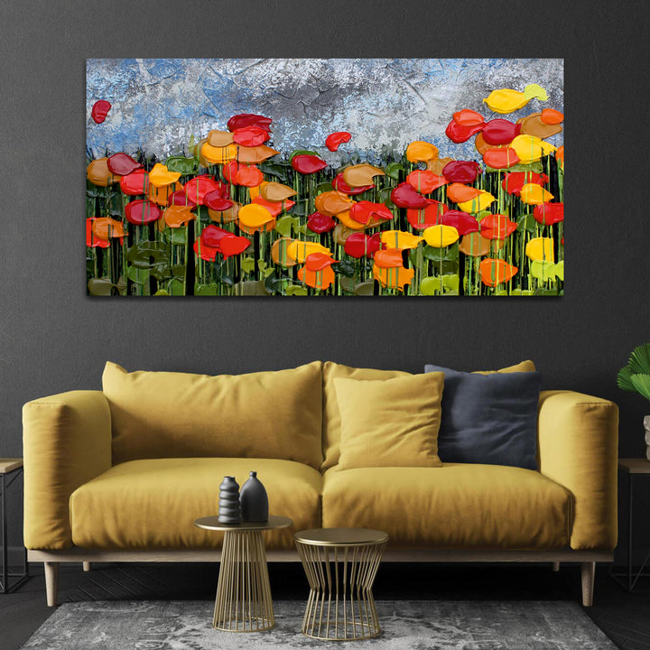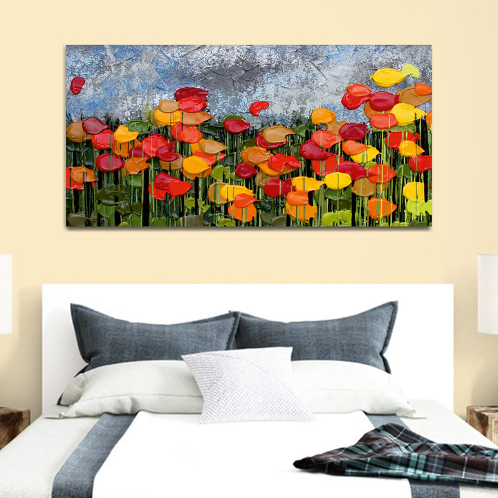 A colorful Flower Canvas Wall Painting and Arts can be described as a vibrant and lively depiction of various flowers in full bloom. Picture a canvas filled with a riot of colors, showcasing a garden or field of flowers in their natural beauty.The painting features a diverse array of flowers, from delicate roses in shades of pink, red, and white to cheerful sunflowers with their bright yellow petals. Other blooms like tulips, daisies, lilies, and peonies add a mix of colors such as purple, orange, blue, and cream, creating a harmonious and eye-catching composition.