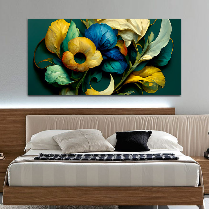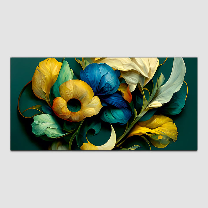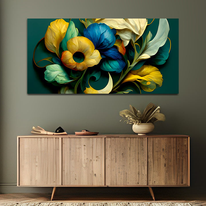 A colorful abstract Flower Canvas Wall Painting and Arts can be described as a vibrant and lively depiction of various flowers in full bloom. Picture a canvas filled with a riot of colors, showcasing a garden or field of flowers in their natural beauty.The painting features a diverse array of flowers, from delicate roses in shades of pink, red, and white to cheerful sunflowers with their bright yellow petals. Other blooms like tulips, daisies, lilies, and peonies add a mix of colors such as purple, orange, blue, and cream, creating a harmonious and eye-catching composition.